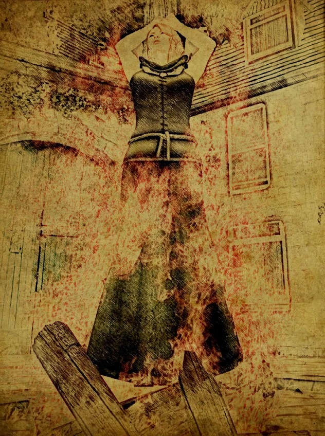 As the flames climbed higher, Aoibheann tried to block out the shouts of the crowd. As she began to shout against her will for help, her vision began to cloud, and a cooling wind seemed to blow across her face. Shocked, she reached out toward it with her mind; it was better than the horrible smell of the fire and her clothing turning to ashes and the already growing stench of burning hair and the beginnings of singed flesh.