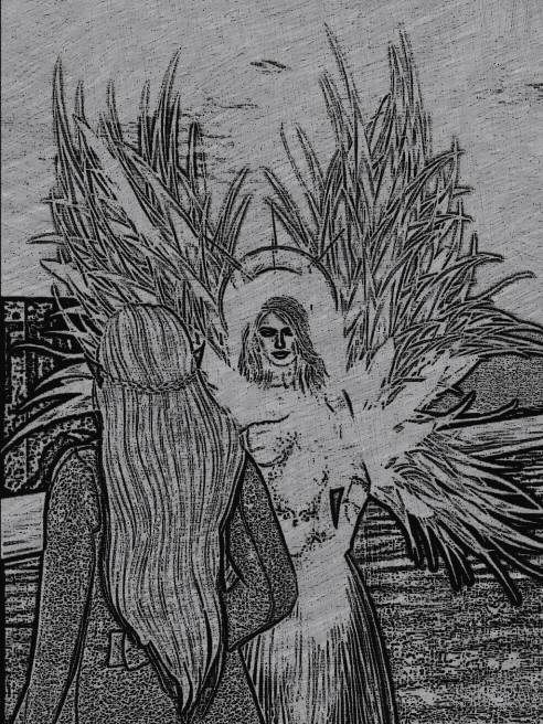 And then something happened. I don’t have a clear memory of it, but there was a blaze of light, and a being full of light was there in her place, was her, and she reached out to touch the necklace I was wearing.
