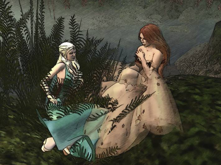 Ket’lyn appeared, and everything went a little strange after that. Aoibheann just … closed up. She really doesn’t like Ket’lyn! I tried giving her the dress, but not even that helped. Ire was coming off her in waves, and I’m sure Ket’lyn could sense it, even though she was obviously trying to be polite and even offered to accompany us to whatever dark forest we were heading into, saying she had more talents than we might realise. We explained to her that the Unseelie King was very old and very powerful, but it didn’t seem to faze her.