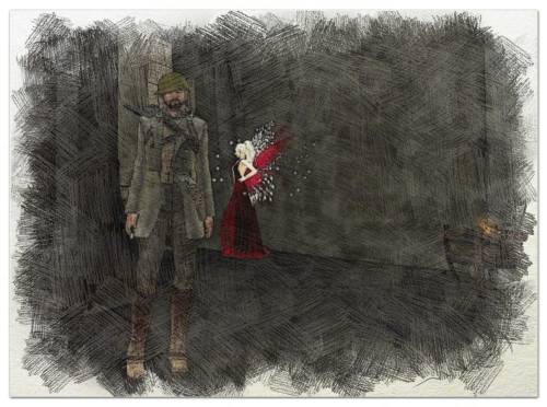 I slept, I woke, I cried, I slept again, in the shadow of the tree. And then I felt the disturbance in the land and flew to Mysthaven, where there was a monster outside the gates. Huge and fanged, he seemed to be protecting Mysthaven from a torrent of sluagh and the gods know what else. I asked Galyanna how I could help, and she told me that once again she needed me to get the people of the village to safety. I was only too glad to leave the fray (I’m no warrior) and flee inside the village gate, where I worked with Hal to get everyone inside the castle and down into the cellars. Nathaniel was there, helping people find their way.