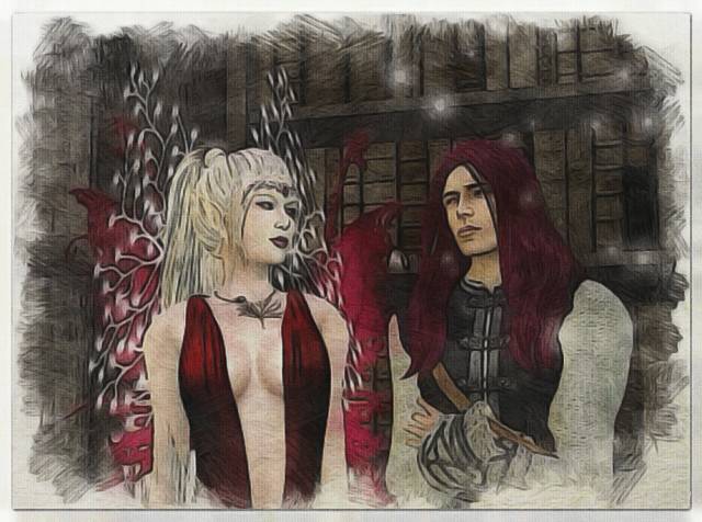 Long, white hair flowed behind Galyanna—I wonder if that’s some kind of warrior thing? I will have to ask a lot of people a lot of things after this is all over. I’m afraid at the time I was so confused I didn’t realise Nathaniel and Galy were beckoning me to follow them; by the time I realised I had to go blind, just feeling Nathaniel’s energy as I walked. We arrived in a little room which I guess is Maric’s study: it was full of Ye Olde Books O Arcane Knowledgye and Gramarye. Galyanna stood before a large mirror in one corner of the room, apparently attempting to contact Vedis, her mistress.