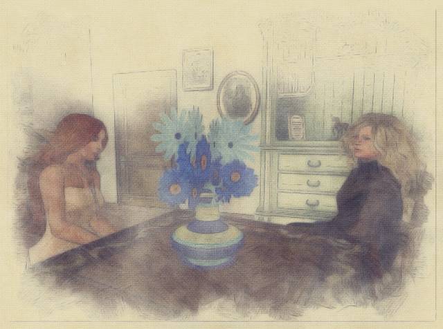 She has changed so much. I am sure she wouldn’t realise it. Or maybe she’d say she’s changed only on the inside. I don’t remember when I did the sketch of her that’s on the wall behind her here, but she looks so much younger and more innocent there than she does in the foreground. She didn’t comment on all the artwork, but then again, she wouldn’t.