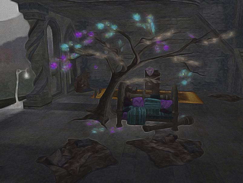 I was so tired, so early! But everyone else seemed to feel the same way, so we all wandered off to bed. I put Ket’lyn up in the big guest bed upstairs, and we discovered Helene asleep on the furs near the library fireplace, so I got her some blankets and a pillow. Aoibheann left us for the tree, of course, and then I made my way to the private residence: it’s not ready for visitors yet, but soon.