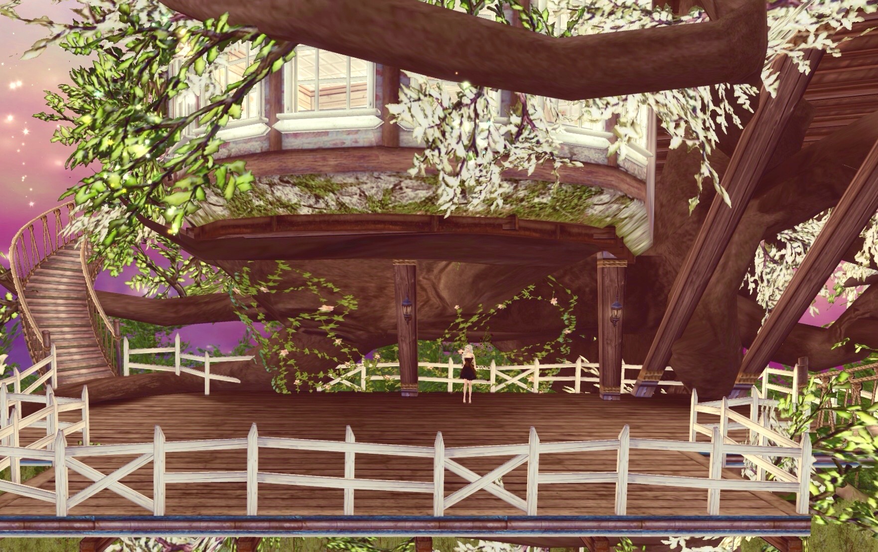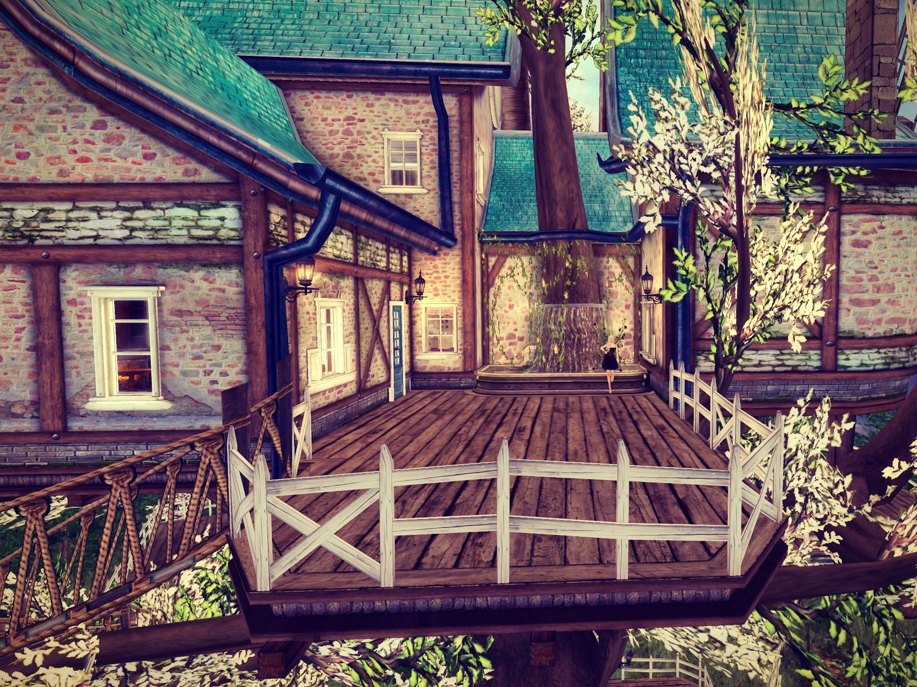 Up the second magical ladder we went; my artist was feeling so nauseous by the time we got to the top he chose not to capture that image. Then, we walked up a rope bridge and onto the entrance balcony. I could see another rope bridge on the other side, but Her Majesty said we should see the interior of the house first.
