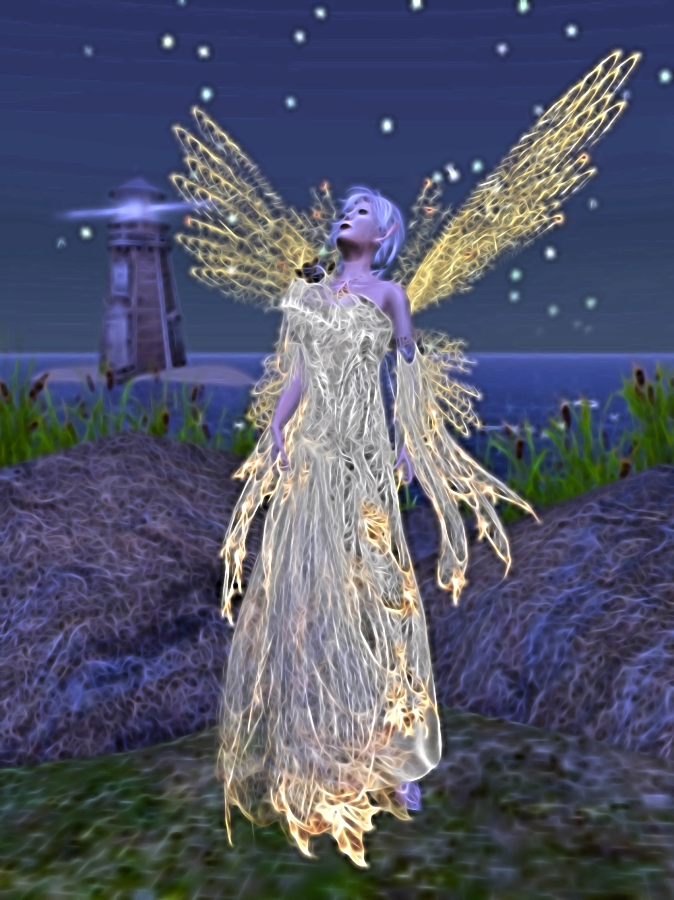 The sketches took ages, so it was well after dark by the time we’d finished; this is the only one he painted as having been sketched at night, though– probably because of the metallic dress and the gold wings. I do love the gold wings. They first appeared when we thought Faery was doomed, back when the sea monster had captured Faermorn. Ever since then, I’ve thought of them as my spirit wings, even though I glamour others for special occasions.