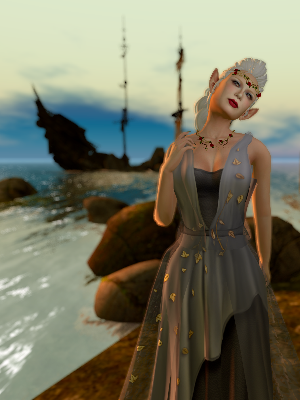 This photo was also taken at Eclectica, but I wanted a dramatic sky, so I ditched the region windlight (I usually do anyway) and went for Torley Linden’s Pleasantrie, which offers a fast-moving sky in an unreal blue. I’ve saved the grey dress for last, because this is my favourite colour of this dress. It’s so nearly blue. And the gold leaves, which were the first thing that caught my eye about WindSong, show up beautifully both against the opaque parts of the gown and in the translucent lace. The dress itself has a look both realistic and whimsical, the kind of look that would make my costuming friends swoon with envy. And I like making my costuming friends swoon with envy; I do.