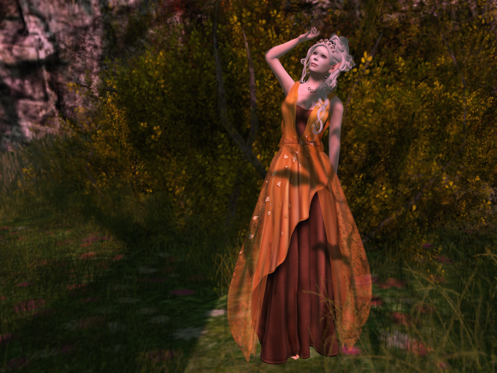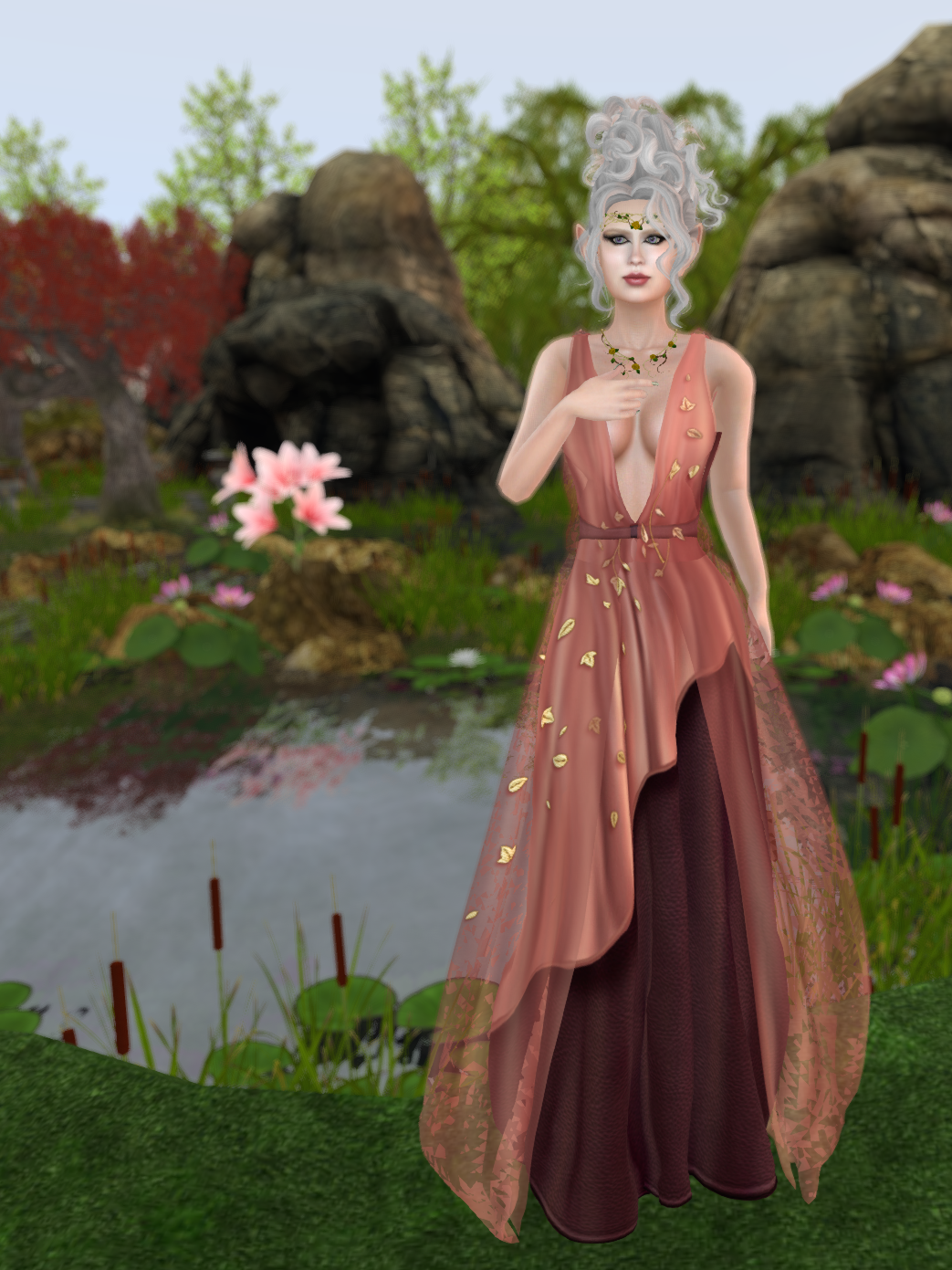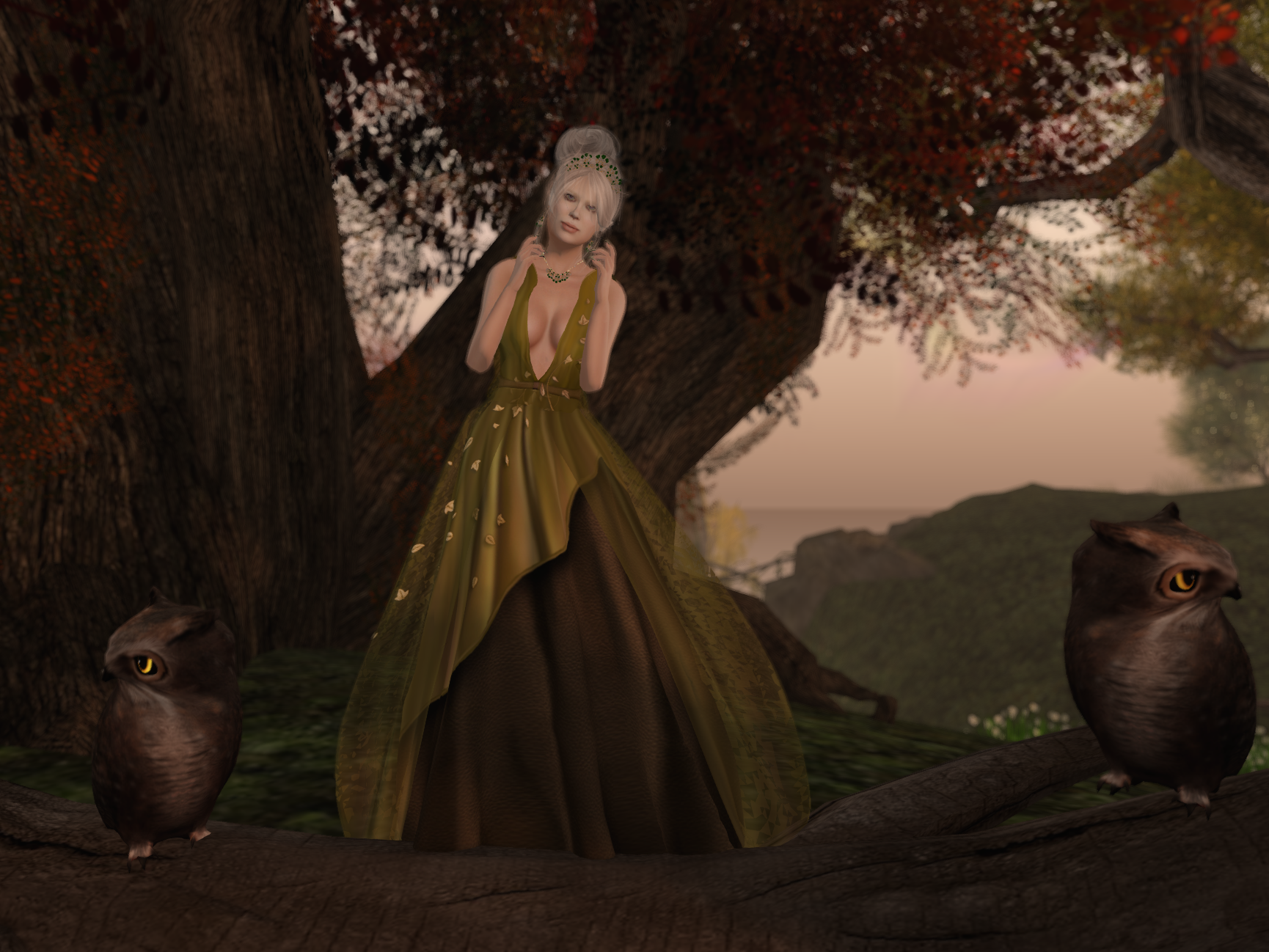 Joining the group meant I got to photograph Gwyneth, at a great location, in an amazing dress, with Our Friend Bambi, AKA Axix’s Forest Deer. But, you know. He has birds on his antlers that kind of match the dress. That makes it fashion-topical, right? Besides, you can see the gorgeous leaves on the translucent overdress really well in this picture, since it’s a close-up. Also, Bambi’s nose was itchy. He has such allergies in the spring.