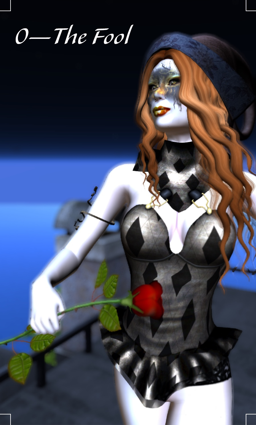 Jongleur might be my favourite fool out of the set. I had this idea for a village fool. Even though I’m not always attracted by Fool concepts that rely too heavily on Harlequin imagery, I like this one. I put her in a latex catsuit (because naturally she’s a contortionist), cropped her hair, and gave her a traditional cap-and-bells attitude I think, even without the cap. She may be a little bet Pierrot in this photo: I imagine she’s somewhat sad because her audience has left her and she’s not sure what to do next.