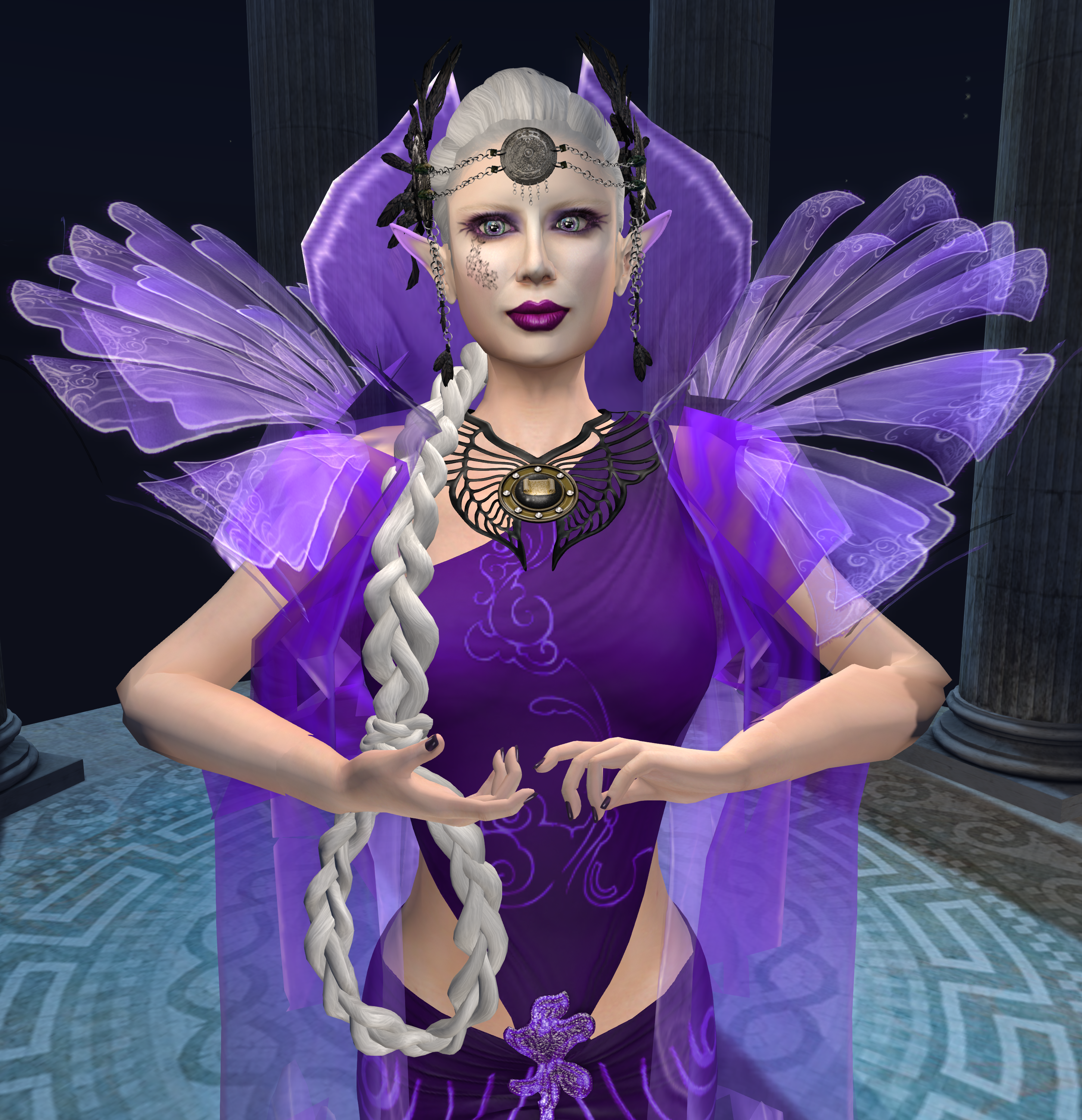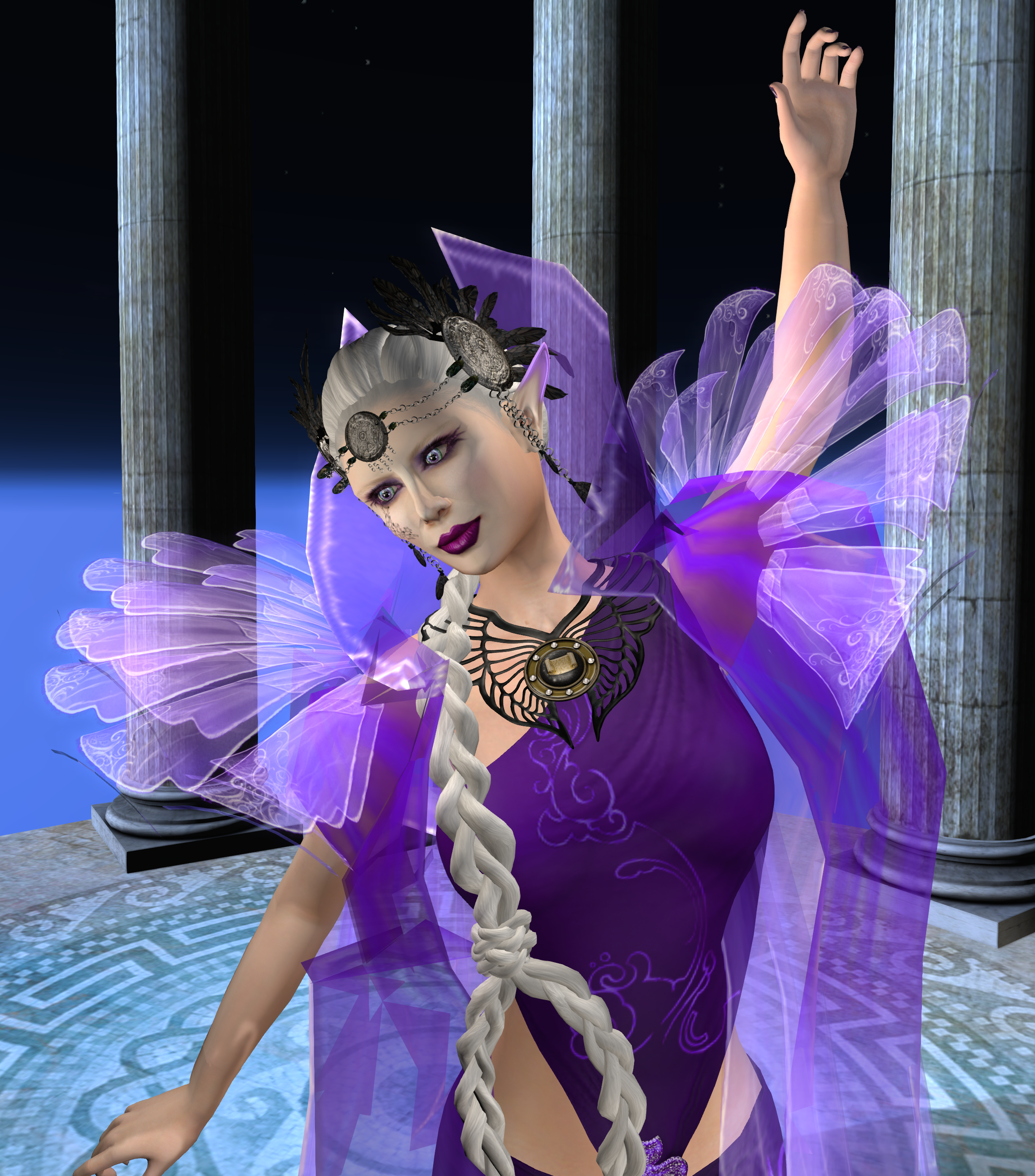There are always beautiful things at the Create Your Own Tarot events, and this round is no exception: I love that ZOZ added the torah scroll to the necklace Gwyneth is wearing here as she plays at being the High Priestess herself. The headdress is from Fuubutsu Dou!, with moon disks and feathers. The gown is from Stargazer, and the shimmery cloak really makes it shine.