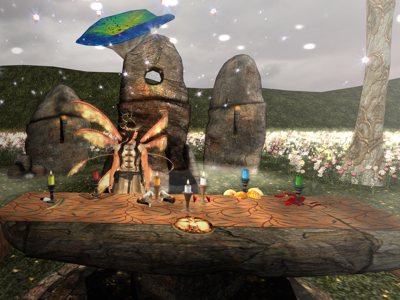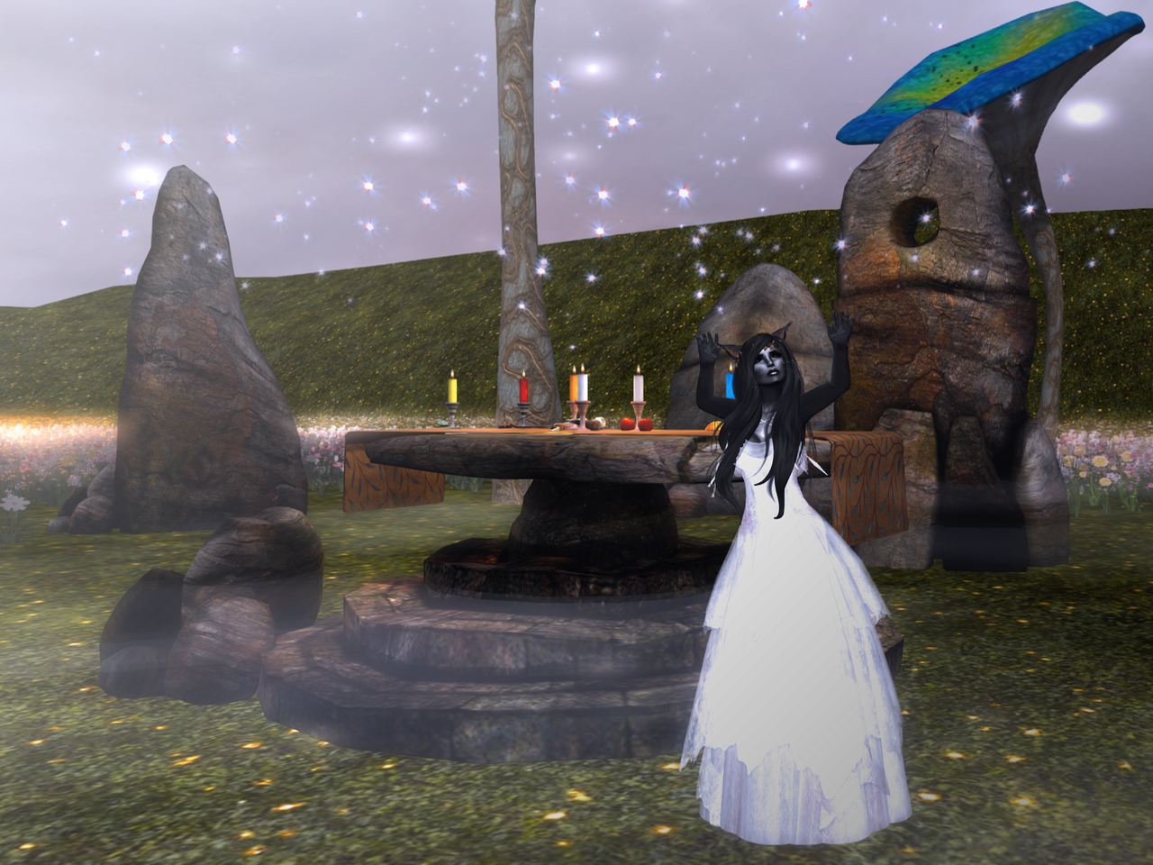 The day was beautiful. I spent much of it in preparation. And of course, the days are still long: we’d have all the time we could ever need. At one point, in a comfortable white dress I found at the Fair Play Faire, I just walked through most of the Great Seelie Forest, and for once I felt content and didn’t need to think about the future, ways to improve the forest, make it more accessible to the Fae. I found Valene, readying the altar. She was beautiful, so beautiful. Seeing her makes me realise how much I miss her. It was so wonderful when she came to give a blessing to our children, and her agreeing to conduct our ceremony was such a gift. As a surprise, she’d brought Janus with her as her co-officiant, another huge blessing.