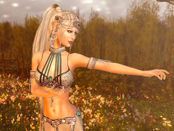 His reply surprised me. He took my hand (and that man’s glamour just makes a woman shiver all over!) and said softly, “My Queen, you used to dance. I used to watch you, in the mornings, dancing in the bower, every morning. Your Court duties make you forget sometimes that you are a dancer, always. And this dress will help you remember that.” So in the end I chose the Silver colour of this, Mistique’s beautiful Samina dress.