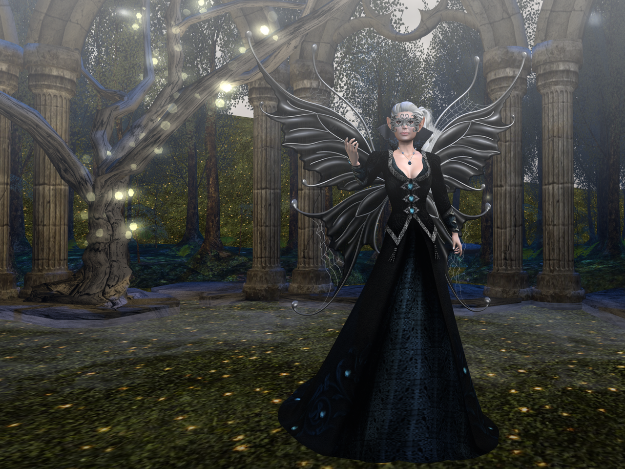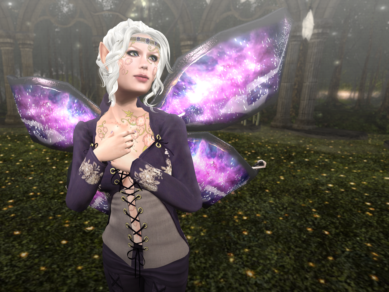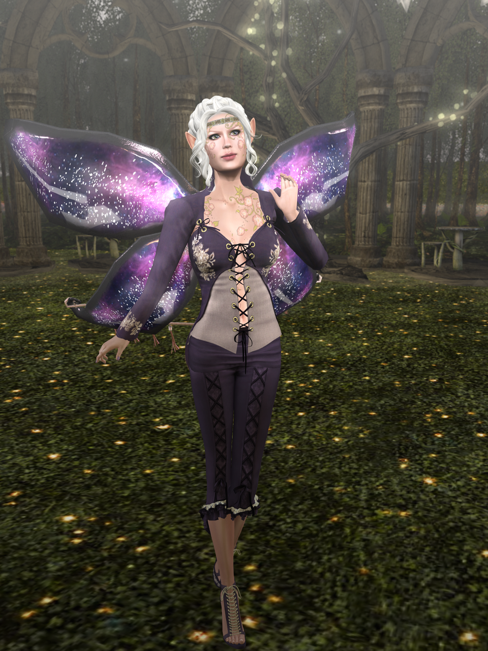Speaking of different moods, sometimes I miss wearing trousers! I remember when I first came to the Lucky Leaf, all those years ago, Aoibheann being completely scandalised that a woman had shown up in the pub wearing trousers. Nathaniel loves to relate that story when he’s telling people about the mortal girl I once thought I was. Jinx makes such beautiful dresses, but I fell in love with this trouser ensemble, because these are trousers I can realistically wear in Faerie. It comes with a matching pair of shoes, but the thing I really love about it, and this is probably my long-lost LARP background talking, are all the laces! Now, if I had to dress myself every morning, they might be a bit of a pain, but my fae attendants love being able to lace me into things, and I love the luxury of being laced into things as well. It’s called Kessick and comes in six colours that could be realistically mixed and matched, since they’re all complementary. Once again, the circlet from Independent Objects is a perfect accessory for the outfit, since it’s so very versatile. Oh! And the wings! These wings don’t come from Fair Play, but they’re so whimsical and fun, don’t you think? I found them at The Fantasy Collective and had such a lovely chat with the wingmaker, La Biche, but she would not reveal to me the magical secret for making the little stars inside the wing membranes actually move! Then again, if great artisans like her revealed all their secrets, everyone would be making wings as beautiful as these. She named them, appropriately, Galaxy.