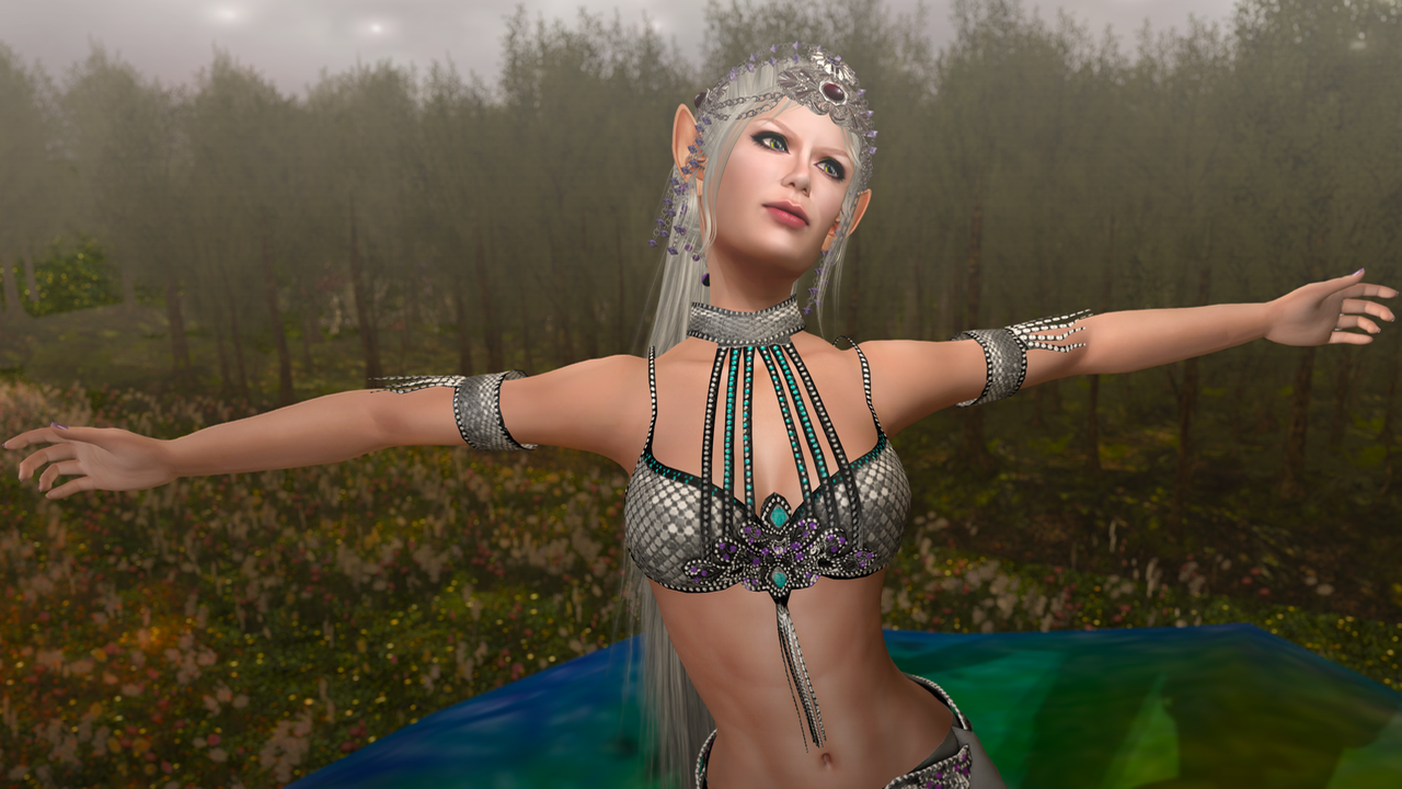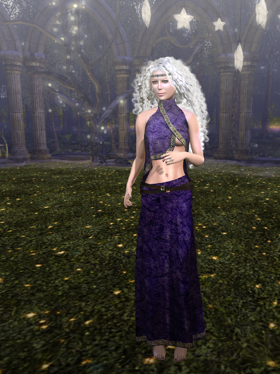 His reply surprised me. He took my hand (and that man’s glamour just makes a woman shiver all over!) and said softly, “My Queen, you used to dance. I used to watch you, in the mornings, dancing in the bower, every morning. Your Court duties make you forget sometimes that you are a dancer, always. And this dress will help you remember that.” So in the end I chose the Silver colour of this, Mistique’s beautiful Samina dress.