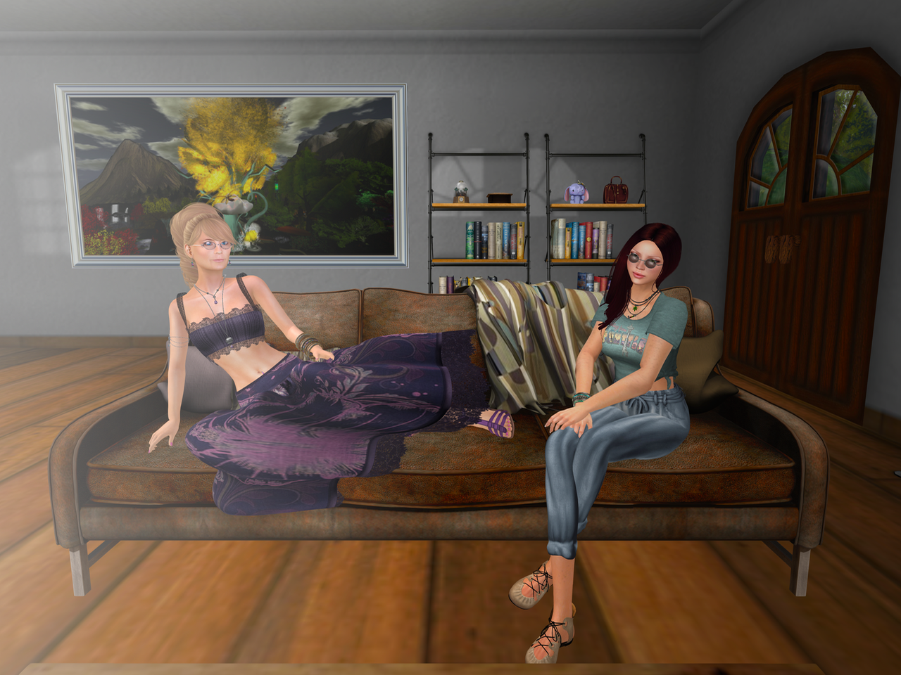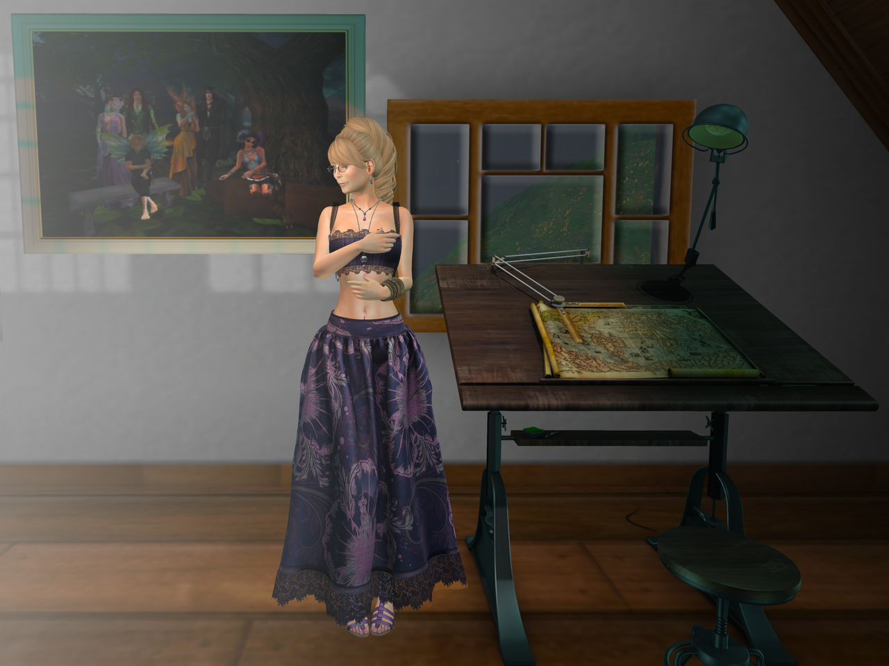 She smiles, and a wistful look crosses her face. “That’s my LARP group, from back in the 2010s. That was the year I got to play the Faerie Queen. It was so much fun. I was crazy in love with that guy I’m standing next to, John. We were quite an item once.” Her eyes crinkle up when she smiles. “And that’s my best friend there, sitting on the log. She played a satyr. We’re still good friends today.”