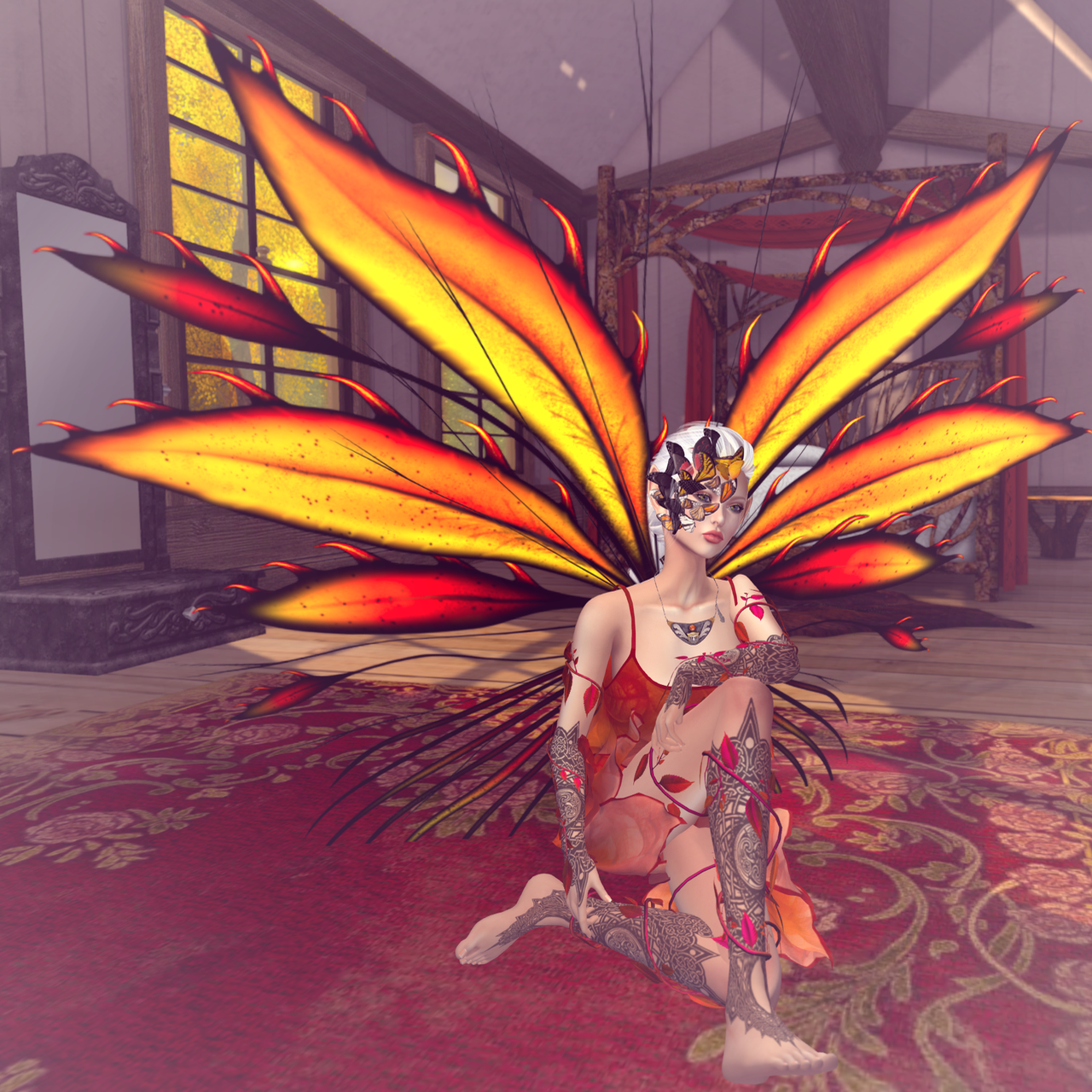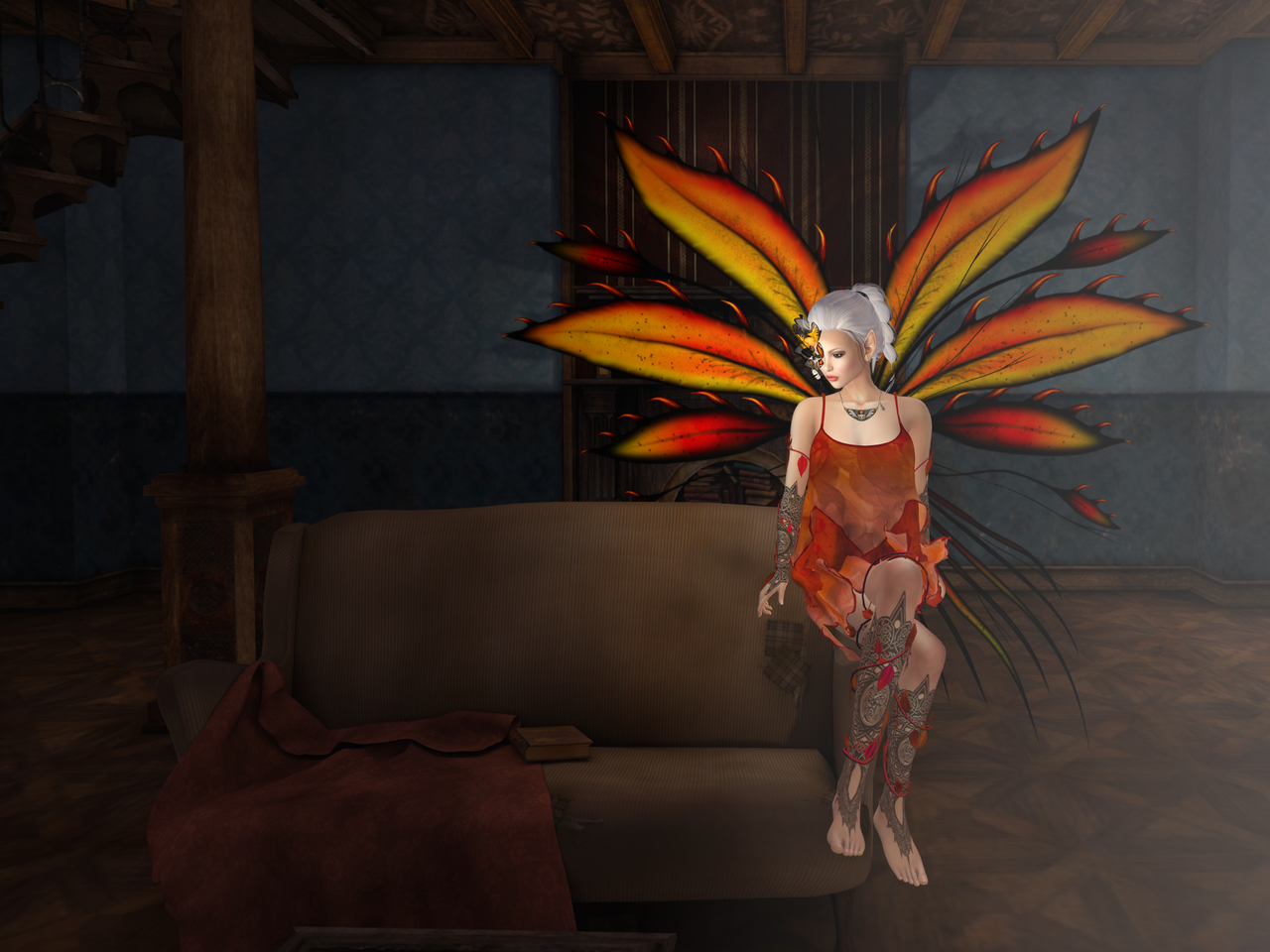 I awoke in the ballroom, on the still-warm ground. The soft blanket of leaves that covered me brushed away when I turned and half-rose to consider my surroundings. I’d gone to bed in my cosy room in the Treehouse, with a warm fire burning and my magical tree lantern burning slow and low above my bed. But now, the trees were dressed for Autumn, and, it seemed, so was I. Leaf wings, a leafy dress, leaves twining round my arms and legs, and the funny pinpricks of new ink on my arms and legs, my hands and feet. Even my body felt different, my face. And the cluster of autumn moths that swirled and lighted on my cheek and surrounded my eye did not faze or annoy me. It couldn’t be just another day.