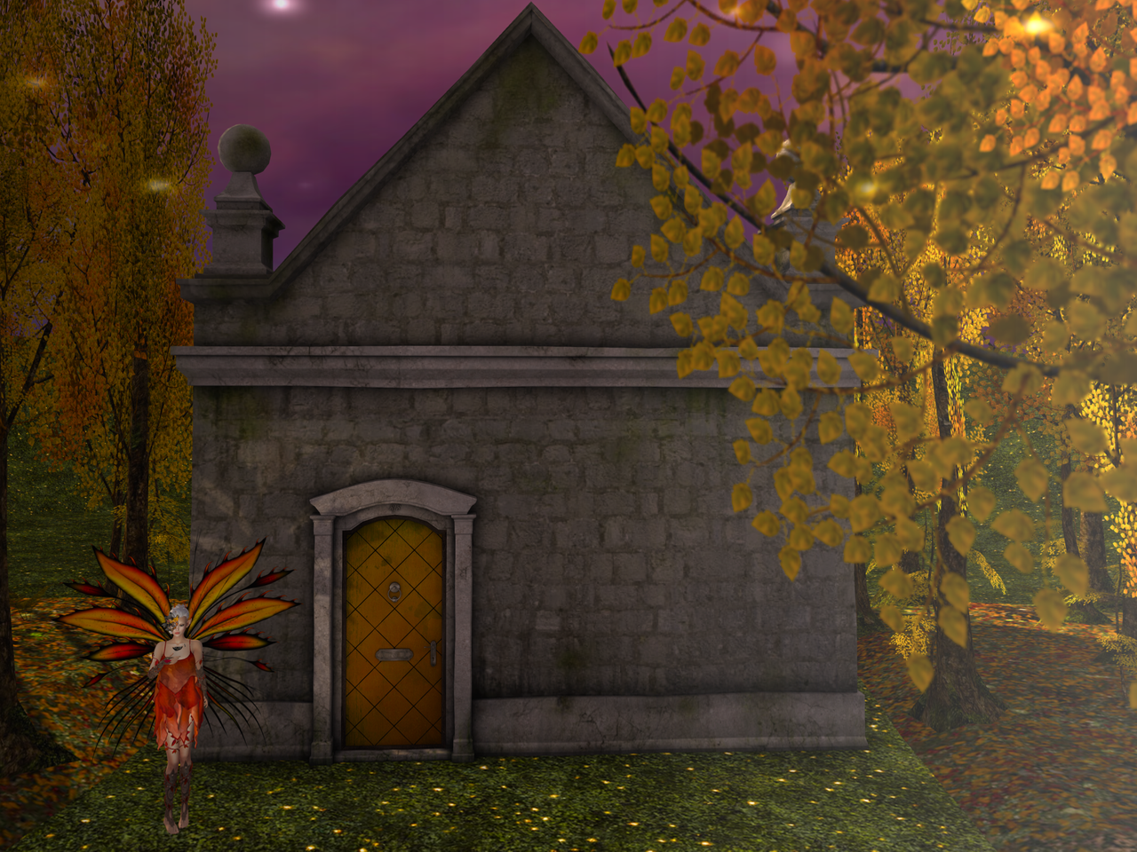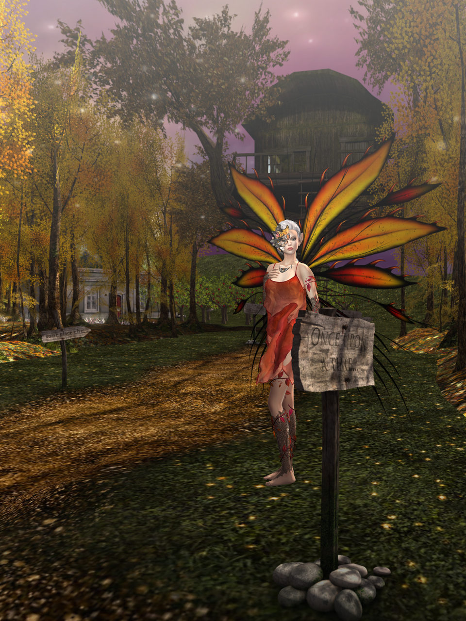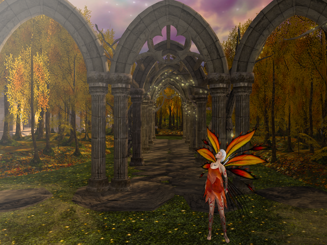 And oh! Look, my loves, at the path from the ballroom. Dressed in yellow and orange, the sky a twilight purple. I felt part of the landscape as I walked, barefoot, down the path an into the Bower proper. On my left, there was a large stone structure, which seemed to be at the centre of it all, but I turned in the opposite direction to see what else might be waiting for me, what the Land had done during the night.