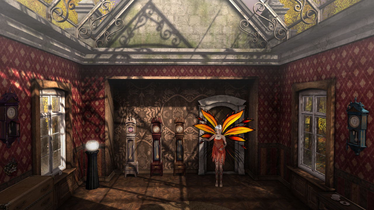 I couldn’t stop myself from going inside. And I found — a room full of clocks. No less than nine clocks on the walls, on the floor, all set to the same time, pendulums out of sync with one another. The ticking alone might drive a woman mad, but when they chimed the hour — and it was seven o’clock in the morning, my loves, a time I think of as “Kitty Cat Breakfast Time,” since that was the time I used to get up and feed the cats back home in Southeast London. I am rarely up at this time here in the Wylds: night revels keep me busy and sleeping til noon is the custom here, of course. Unless you’re Nathaniel, who has to get up and deal with his morning meeting in Mysthaven each day, poor darling.