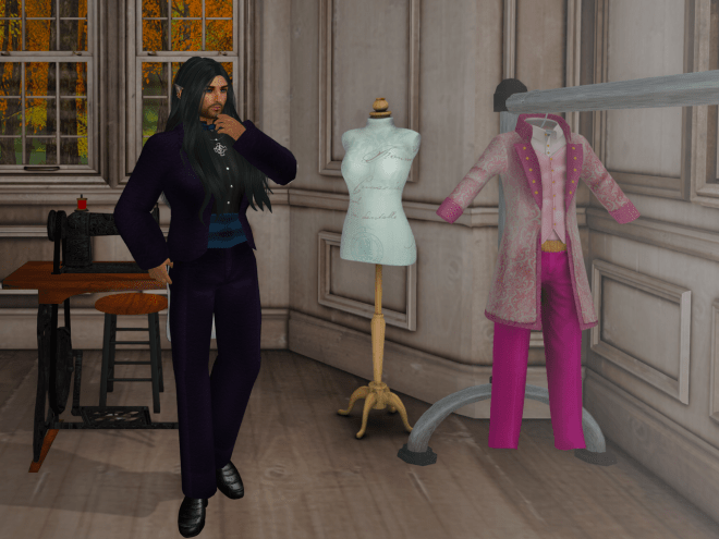“I like it!” I called back. I adjusted my celtic cross so it fitted over the shirt. People are always giving me celtic crosses; I’m not sure why. I looked around at the other suits: one was a deep purple, so deep it was almost black, and there was a shocking pink one on a rack.