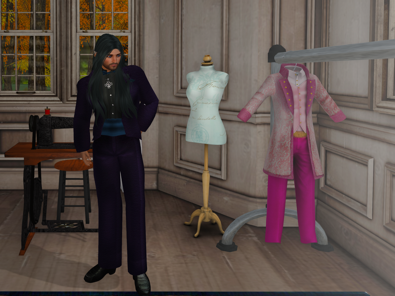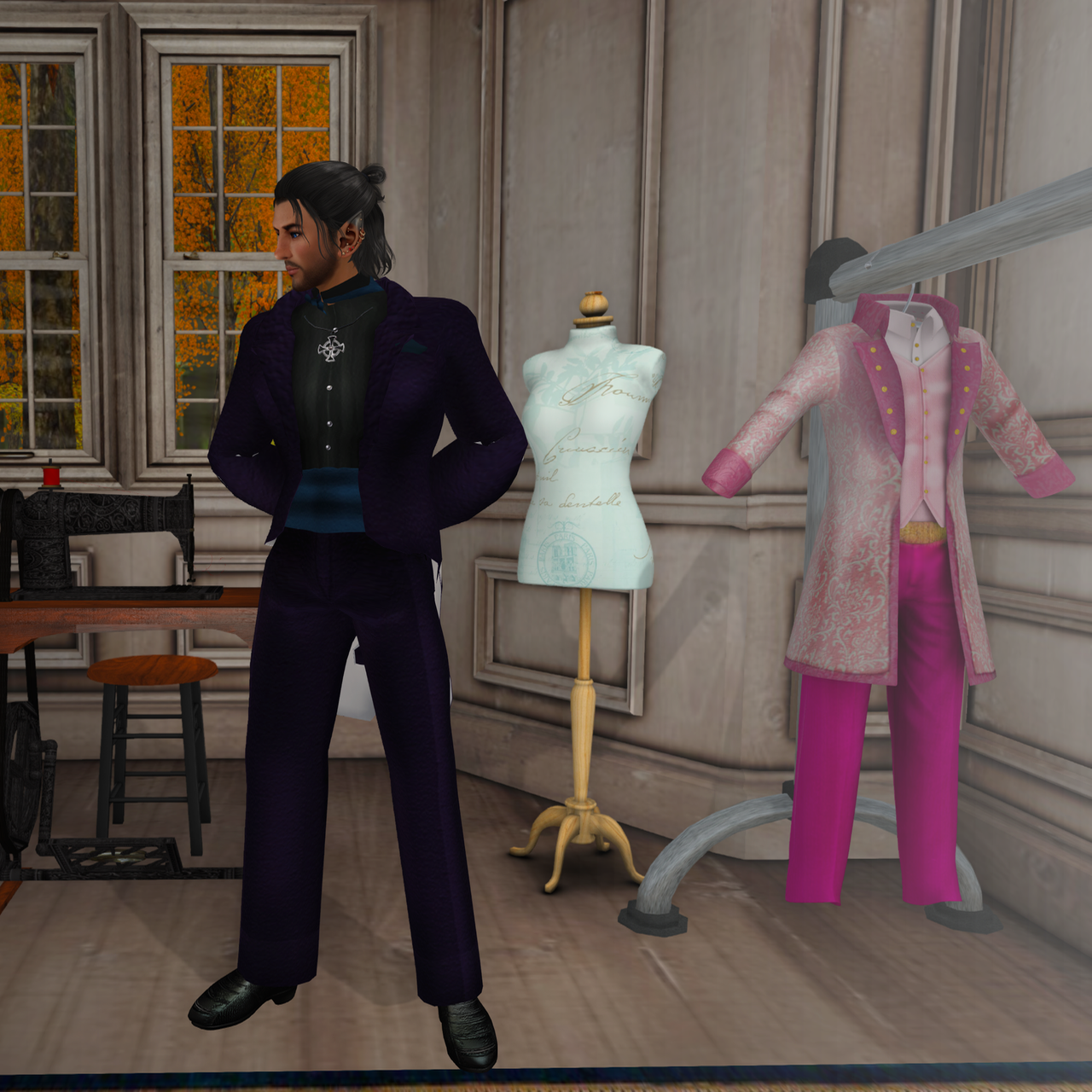 “I like it!” I called back. I adjusted my celtic cross so it fitted over the shirt. People are always giving me celtic crosses; I’m not sure why. I looked around at the other suits: one was a deep purple, so deep it was almost black, and there was a shocking pink one on a rack.