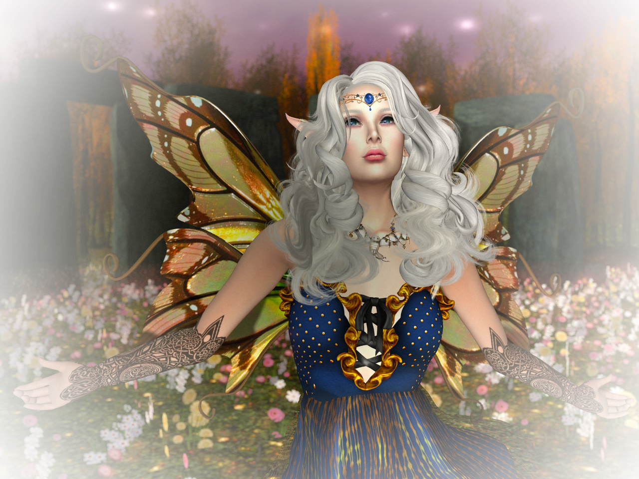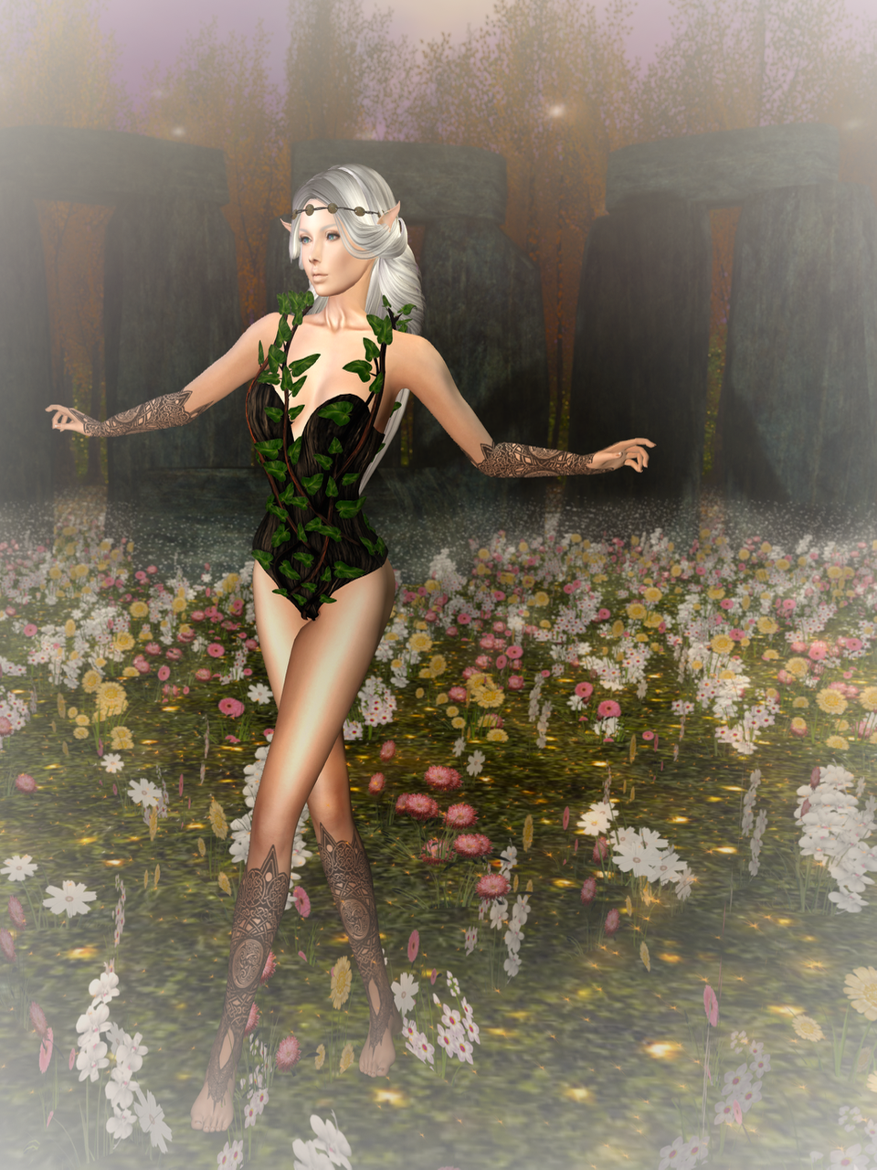In this photo you can get a better idea of the skin definition. Eyes are from Ikon, and the tattoos are the ones Gwyneth has been wearing since the most recent Secret Affair event, the Aigneis & Airell tattoos from Things. Bonus: Pumens includes all the major appliers in simple-to-use HUDs, one for the head and another for the body, so it is super easy to apply. The field of flowers, by the way, is the amazing Ichi Fields from The Looking Glass, which I fell in love with at the 2015 Fantasy Faire; it’s been a staple in every iteration of Gwyneth’s Seelie Bower since it became available at the Faire. The stone circle is from Gor Con and again has been a staple of every build; it was an ultra-rare at the Age of Vikings event from yonks ago. Background trees are the Enchanted Wood from Studio Skye.