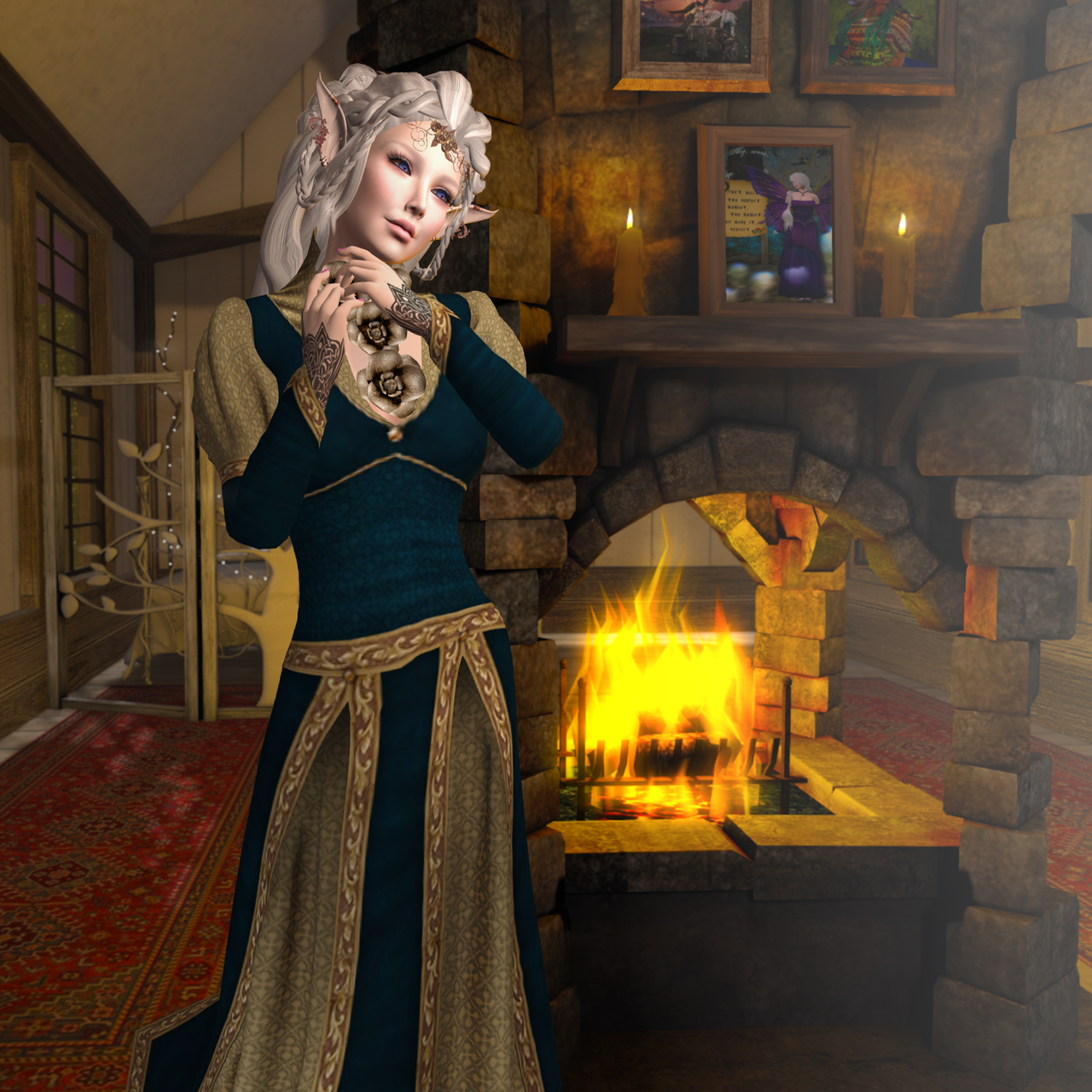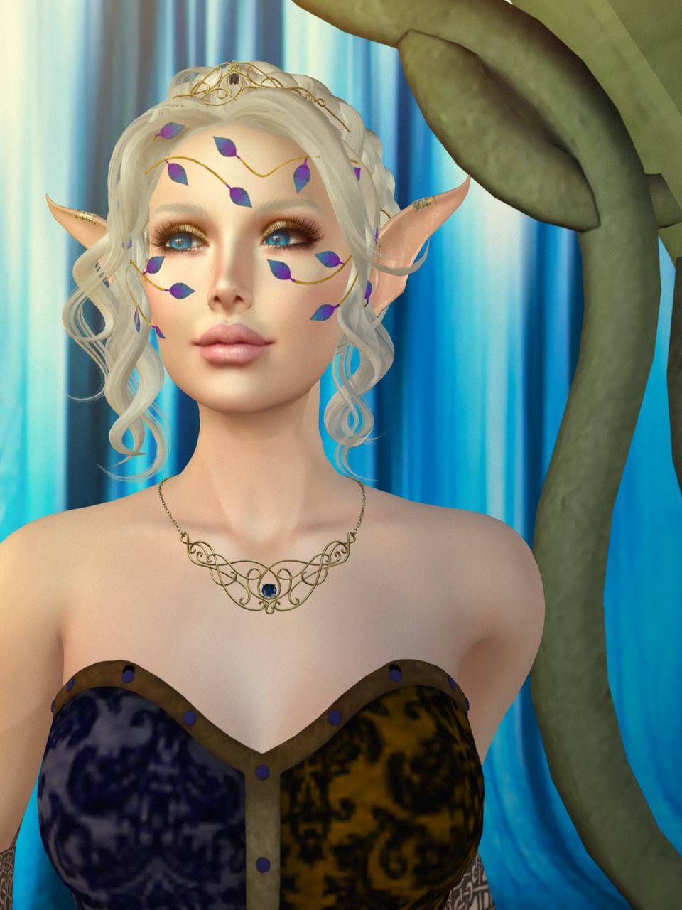 There are a couple of reasons I chose to put this photo in twice. First of all, take a look at the beautiful jewellery Gwyneth is wearing. This is from Cae, called Isabelle; the necklace and tiara are from the same set. It’s not new; it’s a staple of Gwyneth’s wardrobe. The tiara works beautifully with one of my favourite Analog Dog updos, Molly. I got this at the 2015 Hair Fair, but it’s now available at the Analog Dog Main Store. The face jewellery is from Spyralle, called the Forest Edge Mask, and it comes with quite a lot of texturing options. I picked up the mask at an event that I don’t think is happening any more, Illusion Point, but it’s now available in the Spyralle Main Store. Now, remember I said I was really loving playing with Catwa head appliers? This is yet another one, this time Morgana from Pink Fuel. Pink Fuel has been one of my favourite skin designers for years; I lived in Harley for most of Gwyneth’s life as a Princess in the Ashmourne Seelie Sithen. The lips on this skin are so beautiful, not over-puffy, and wide enough so that Gwyneth’s mouth looks realistic; Pink Fuel also does an amazing job with makeups, and there are several choices on the Morgana applier, which comes with a version for both the Jessica and the Annie mesh heads from Catwa. These appliers weren’t at We Love Roleplay; they’re available at the Pink Fuel Main Store. The stunning eyes are from Ikon, natch; they are Triumph Eyes in colour Electric.