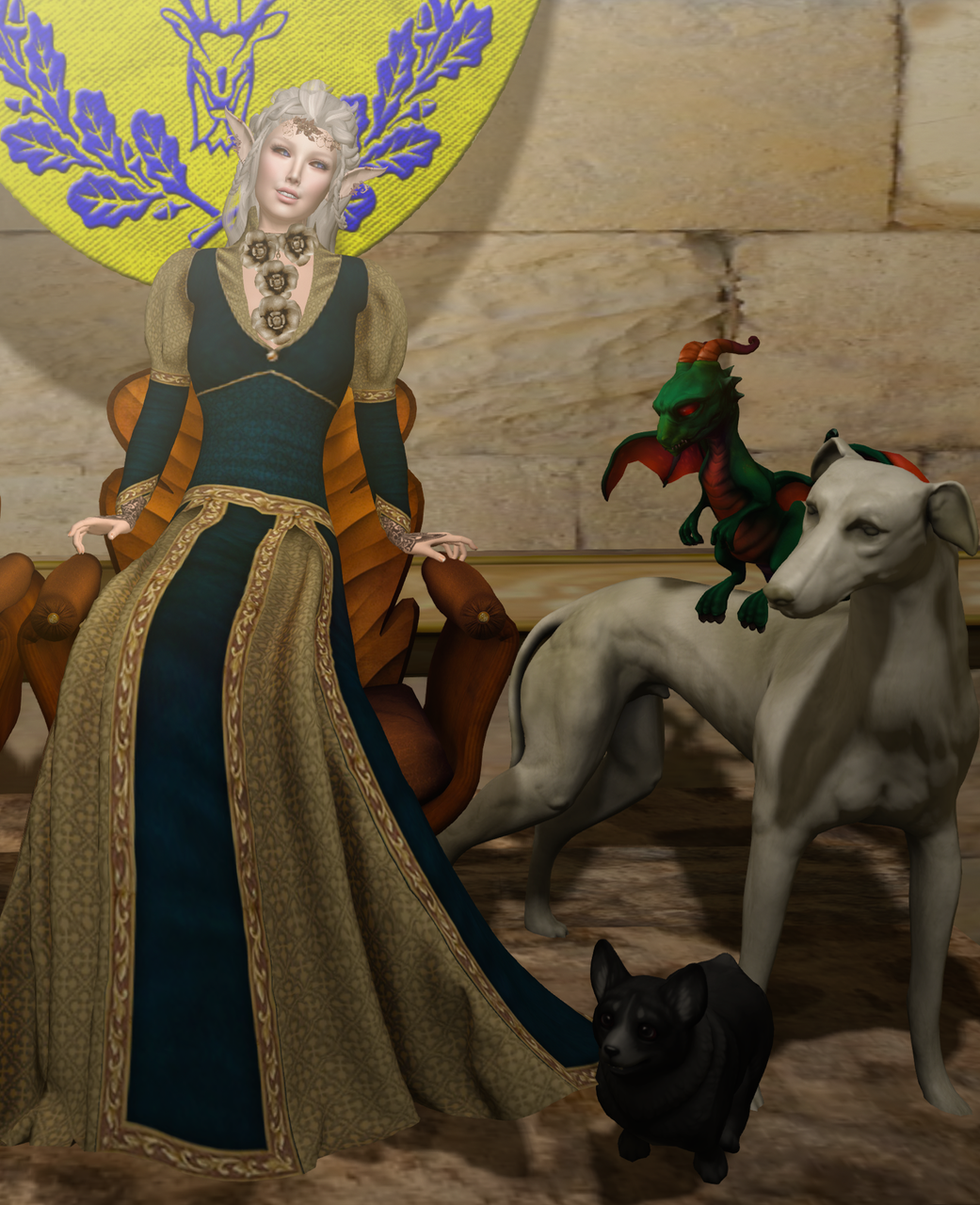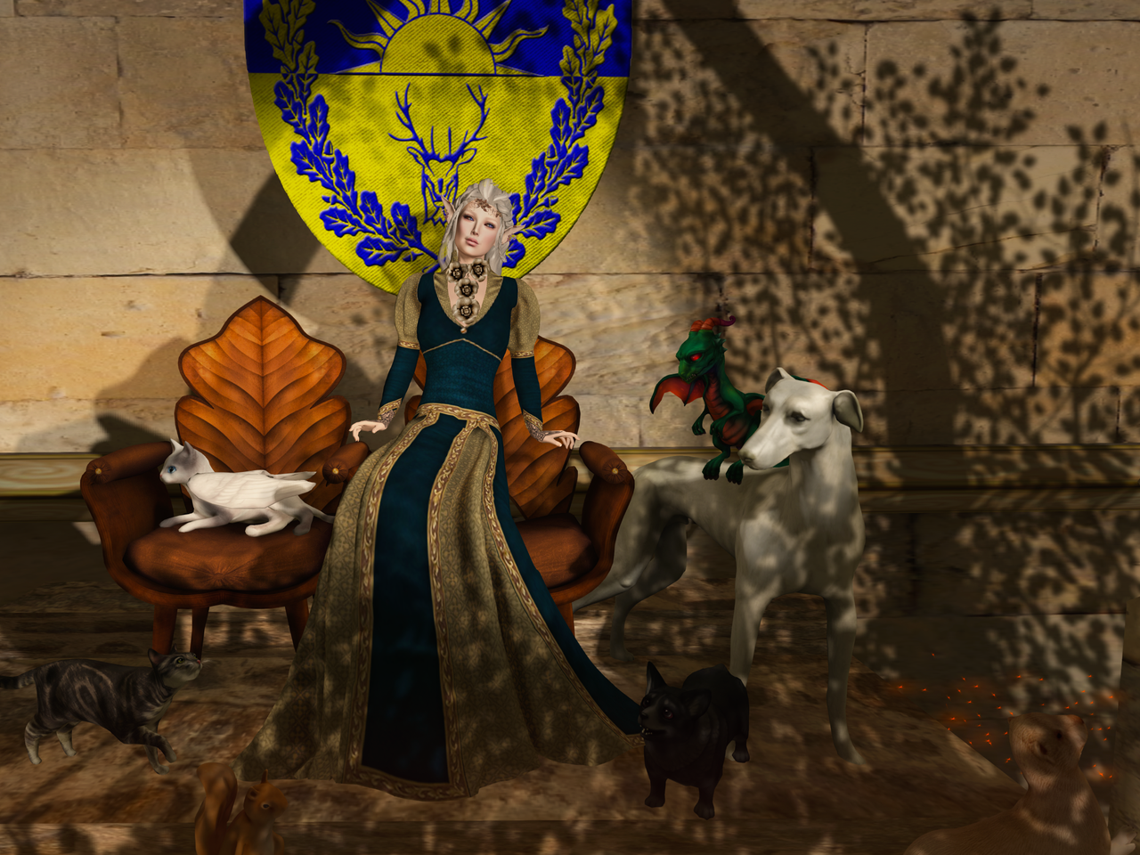 The Leaf Chairs from Ginger Line come in two different colours; this is Version 2. Version 1 has a green cushion and accents. Gwyneth is wearing the Beatrix gown from Les Encantades, available at We Love Roleplay. I love the sleeve accents on this gown, and Les Encantades has such a deft hand with texturing. So many animals! The Greyhound is from last month’s Chapter 4; he is from meadowWorks. The Winged Cat is from Half Deer, a gacha from a past Kustom9. The Curious Cat was a gacha from Fashionably Dead, and I found him at a past Arcade Gacha event. The Corgi and the Dragon were supplied by Dyisi Oppewall, who helped me set up this shot, and I forgot to ask her where she got them, but I’ll add them in later. The banner hanging behind Gwyneth is custom heraldry created by Nathaniel Ballard, Gwyneth’s IC Consort and one of the wonderful Wicked Wylds storytellers.