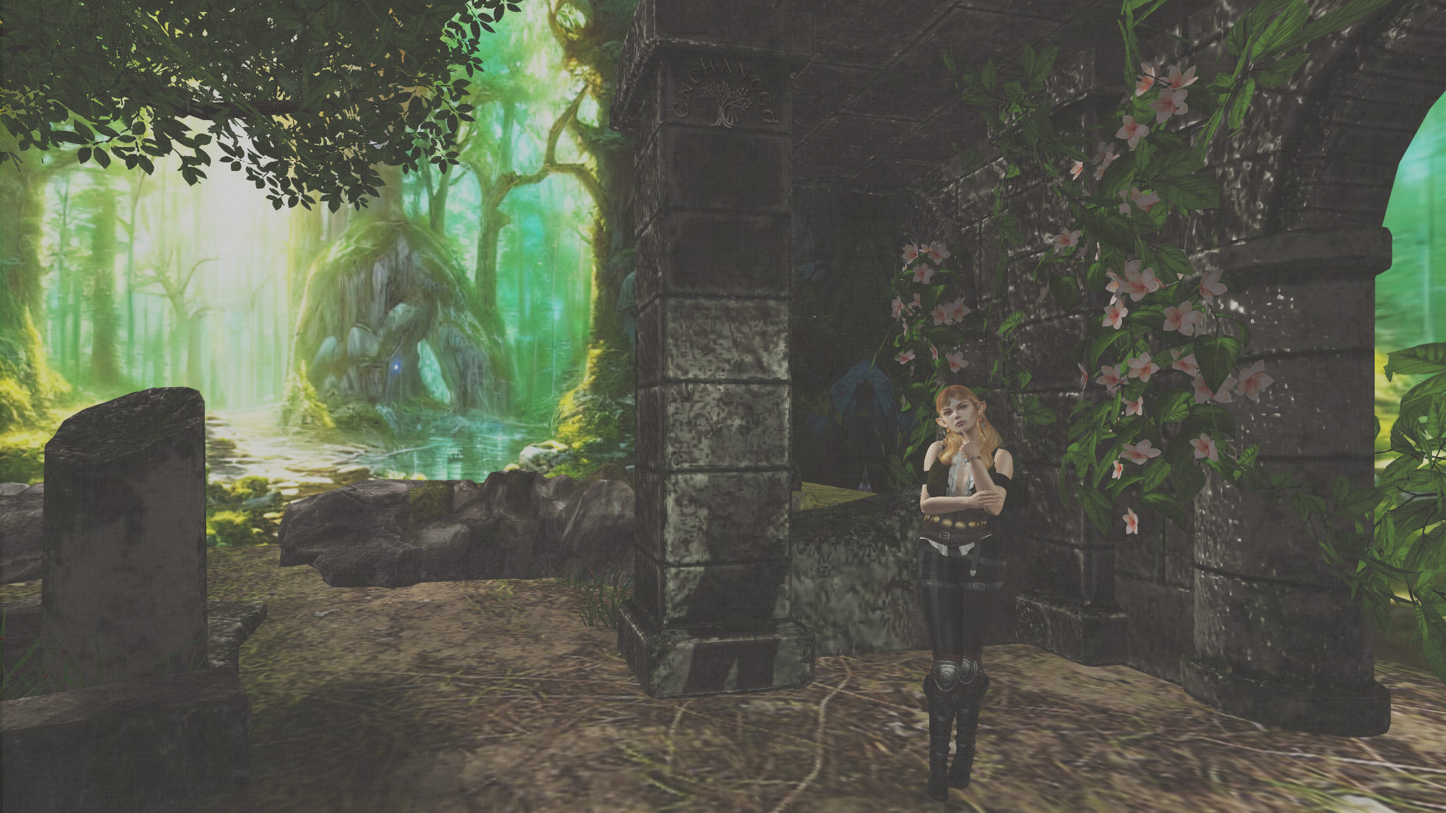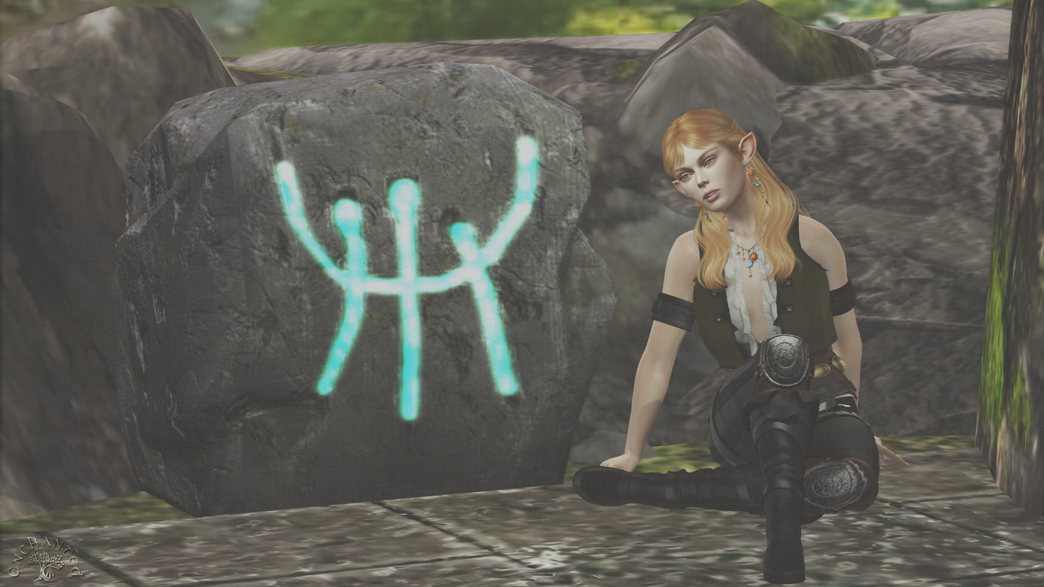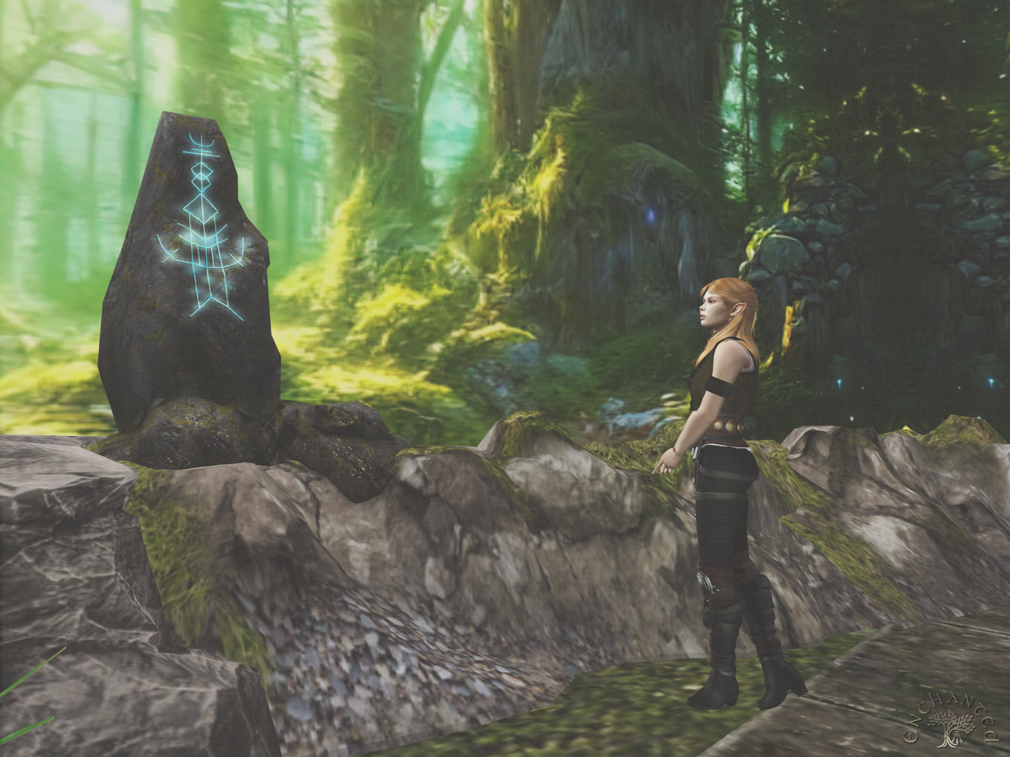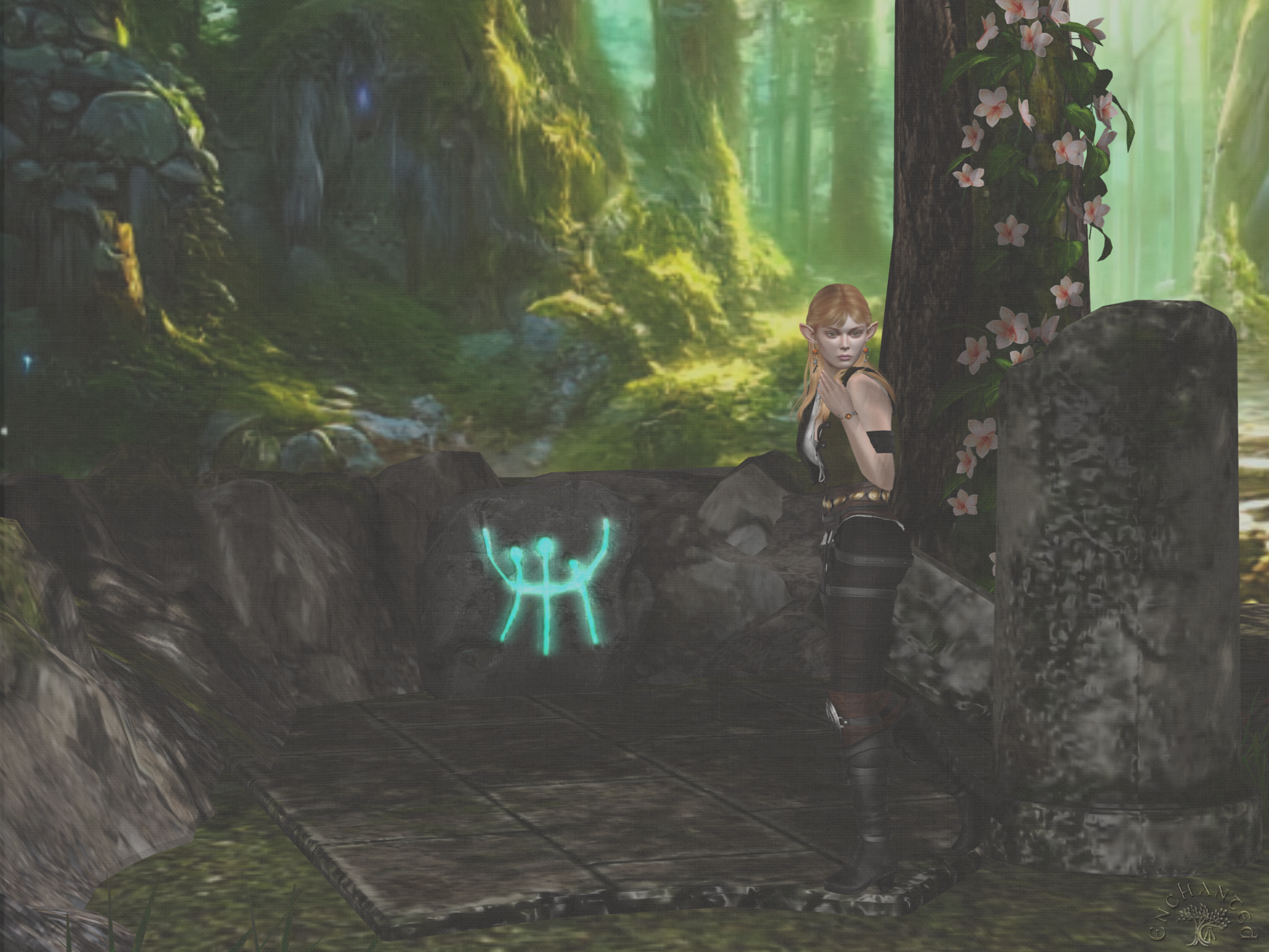 The whole place had a springy, summery vibe, which makes sense given the time of year and Gwyneth’s devotions to the seasons themselves and the cycle of the Earth. I’ll grumble another time about how since technically we’re not on Earth we shouldn’t have to mirror Earth, but whatever. There were flower vines everywhere wrapping round the robust trees. It was easy to imagine this as a place Nature Herself had recaptured from some ancient human or human-like hands, but then I came to a series of strange boulders marked with symbols both familiar and foreign. This one… I thought I heard a voice behind me just as I found it… this one reminded me of the Awen from which Awenia takes its name, the symbol of bardic inspiration in Her Majesty’s pre-alchemic-cosmology Druidry. See, there are three rays coming down and you could imagine the semicircle there as a sun sign. Maybe these were things the Queen herself had built and forgotten?
