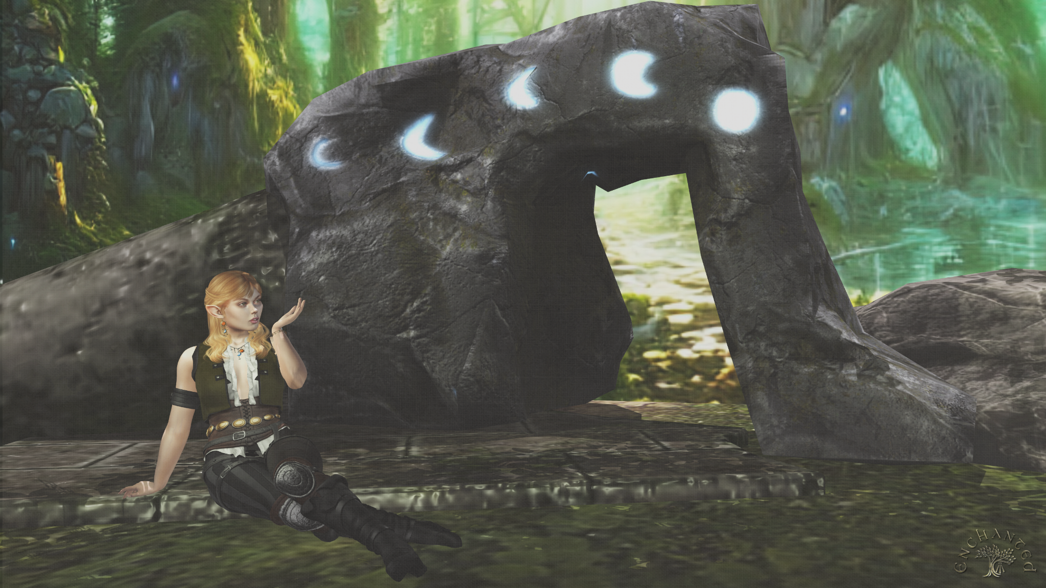 As I turned and looked for the way I’d entered this magical copse, I spotted a third glowing stone, this one in the shape of an archway. It seemed to mark the entrance to a sunlit pool, beyond which was another archway, perhaps made of trees. I didn’t dare go in that direction, but I did take a few minutes to consider the roughly rendered moon phases on the top of the arch. The moon here is in her first quarter; I wonder what would happen if I returned (assuming I could ever find this place again!) when the moon was full or nearly so. I imagined as I sat there that perhaps the while scene, the whole surrounding landscape, might change and morph into something different, though I didn’t dwell on what that landscape might be. I yawned. The shadows were definitely growing longer.