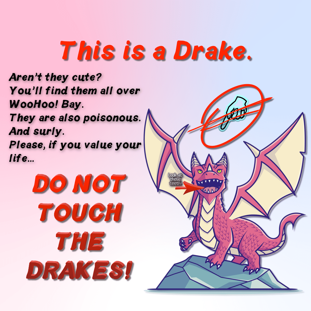 One thing they do not tell you in the tourist brochures is that aside from the thriving population of painted lizards, this island is also populated by small dragonets known to the locals as drakes. In fact, one of the first things you’ll see when you enter the Bay, whether by portal or on foot, is one of these signs: