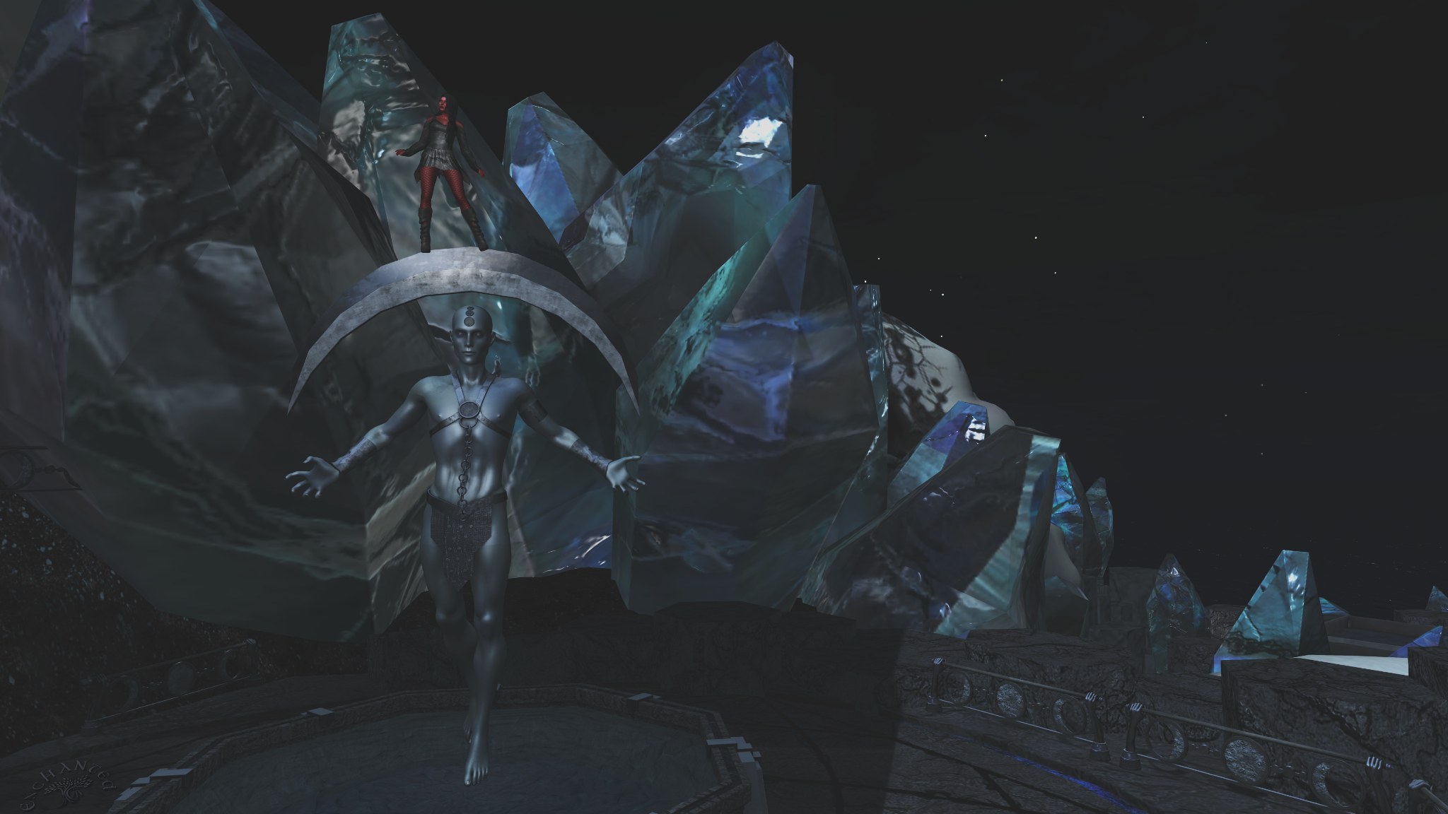 I think the light shines beautifully on the crystals in this part of Dingir, and even though the portal probably doesn’t lead home to Iceland, I can imagine the crystals as ice crystals and consider a trip to Egilsstaðir instead of Þingvellir, ditch the family, play in the Fjarðará til it gets dark, which since we’re into May now will be pretty darn late. But I also want to balance on this woman’s nose. So instead of planning a trip, I did that instead. It was right there, after all.