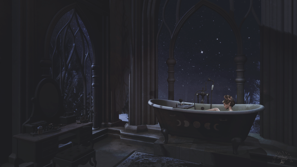 The tub was set right next to—I mean, it wasn’t exactly a window, because there was no glass. It was more sort of an archway. But it was made so I could look out onto the endless starry landscape. And the water was hot, and the bubbles were nice.
