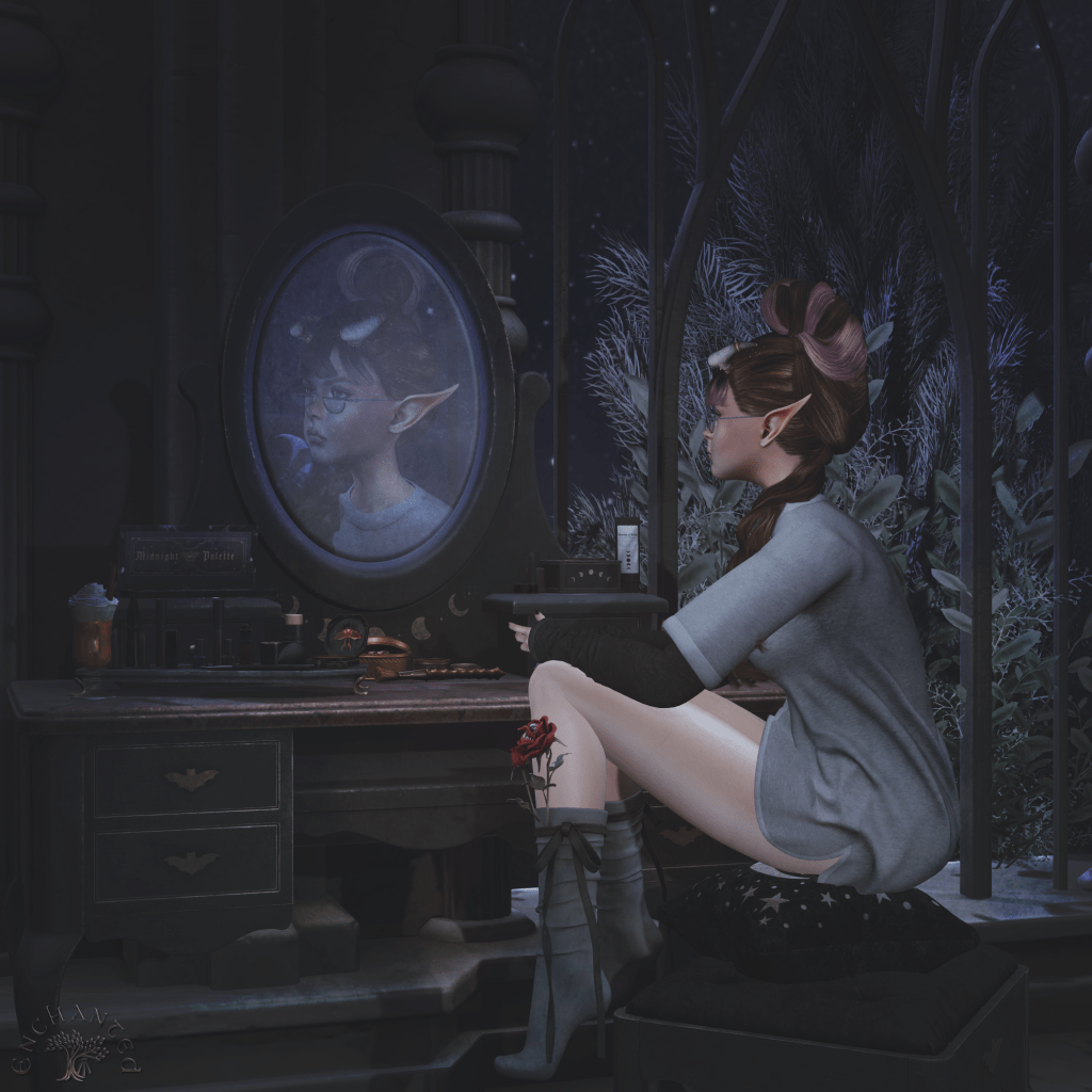 Dear Guest, it said. If you are concerned about your appearance, please avail yourself of your own personal magic mirror. It’s in the vanity in your room. We also provide a number of upscale cosmetic products from Hexumbra for your use. We hope you enjoy this detail.