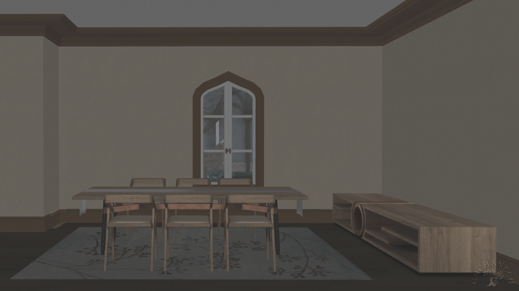 I’m choosing to put the dining area by that first window you see on the right; there’s a little bump in the wall that gives the area some shape, and this way I can bring a large space into focus with different interest points at different places. (What? I might be a goth Christmas elf, but I’m also a designer!)