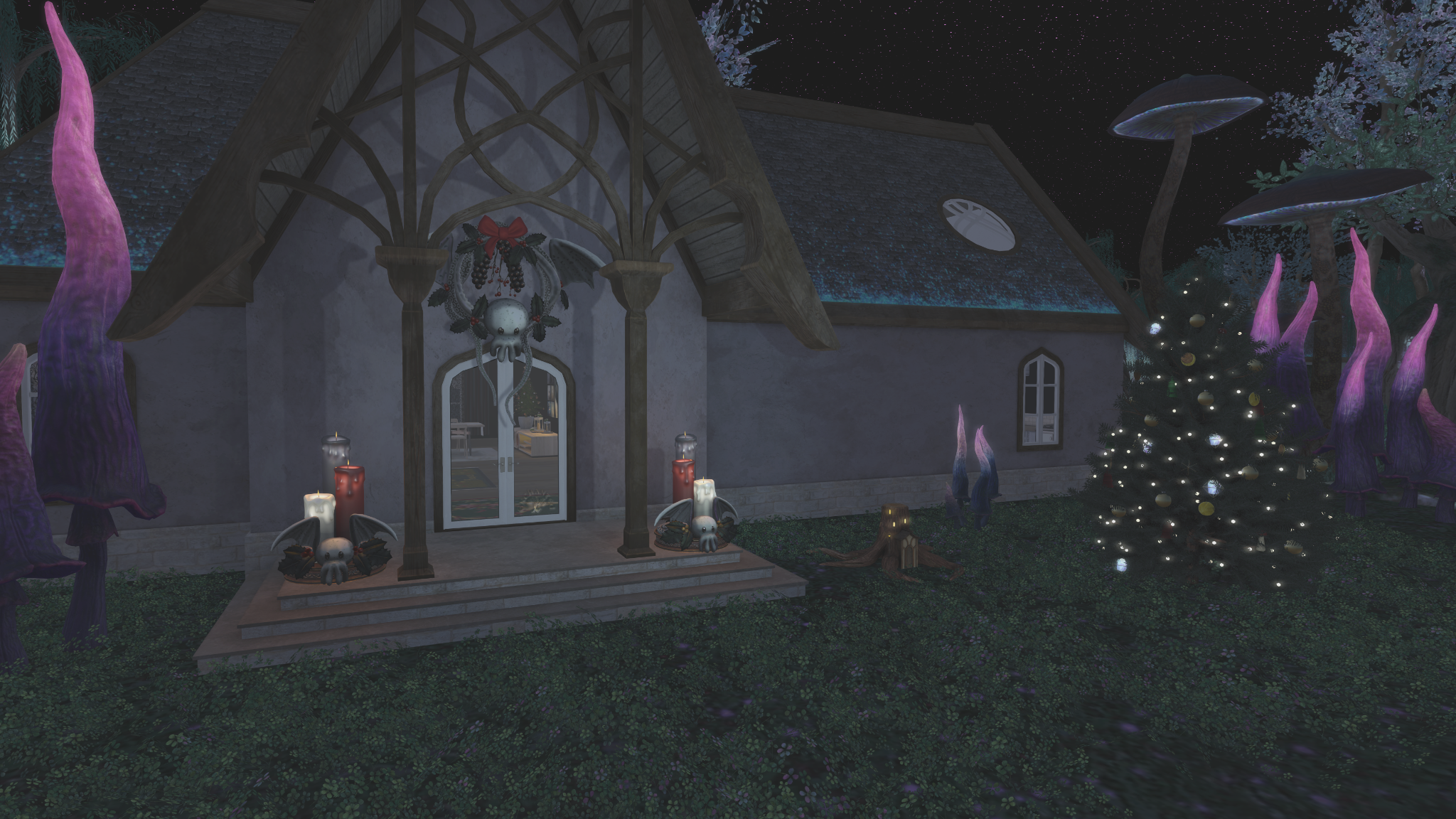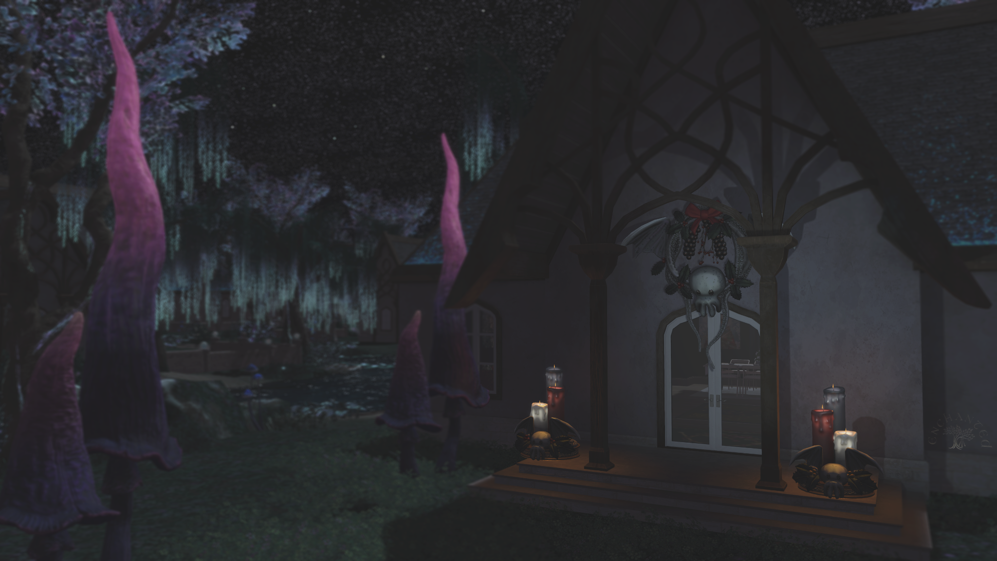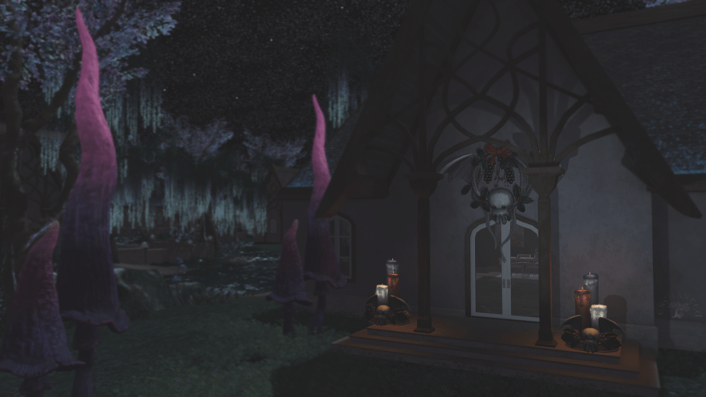 I explained that placed thusly over my door, the Great Cthulhu is always watching over me and protecting me from anything more terrifying than himself. I went on to explain that there’s a large tree and a tree for fae to hide in if they are pursued or just need a little nap.