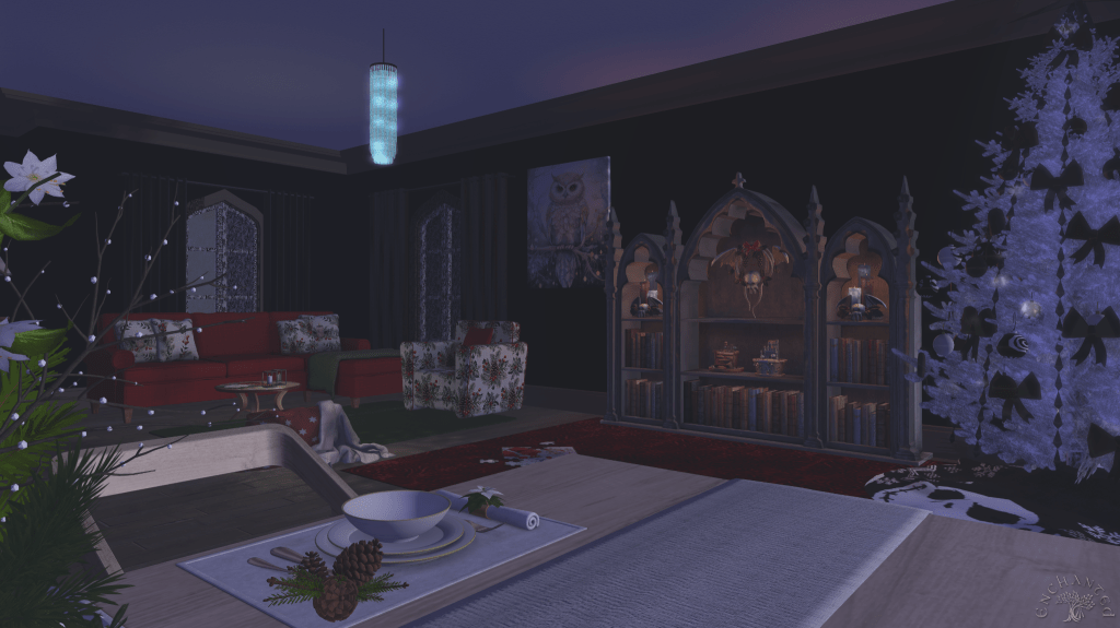 Putting this part of the room together was a lot of work! So much moving of furniture. I had to get a couple of apprentice elves to help me out, and they were much more interested in drinking cocoa than moving furniture, so the whole thing took longer than it should have, but at least I have my tree up and some comfy places to sit, plus another beautiful shelf where I can keep important things, like books and my gorgeous Cthulhu candles.