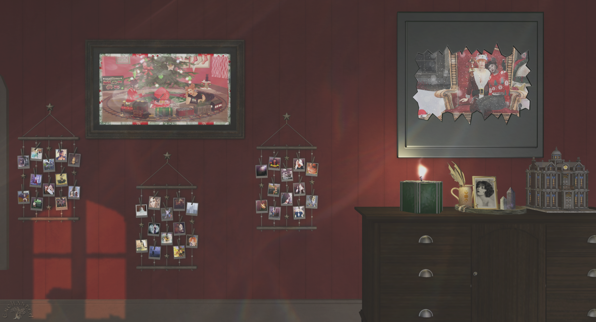 ‘Look’, I said. ‘I have pictures of all my friends to signify the importance of friends and family. ‘I even had my picture taken with Santa Patch, and Kara took a picture of us eating cookies, underneath a Christmas tree, with a train‘. I gestured to the sideboard. ‘I have a beautiful green candle in the shape of a star, and a miniature town hall’!