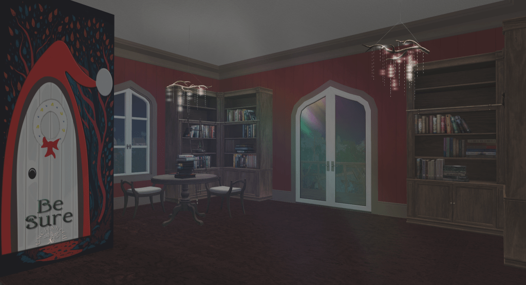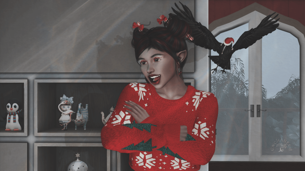 Cahoots? Who says that? ‘OK, I’ll address the second thing first’. I was mumbling; it wasn’t pretty. ‘This is Draum. He just showed up a couple of weeks ago, and he keeps me company, and I like him’. And he’s in a Christmas hat, Pixie. I had to stop myself from rolling my eyes and saying that out loud. ‘And there’s plenty of Christmas spirit here! My Santa Baby sweater has lights! And there are red wellies! I even painted the inside of my house red’. Wasn’t that enough? ‘I can explain everything’, I said. Oh, great, Nocturna. You’re acting all subservient; she’ll love that.