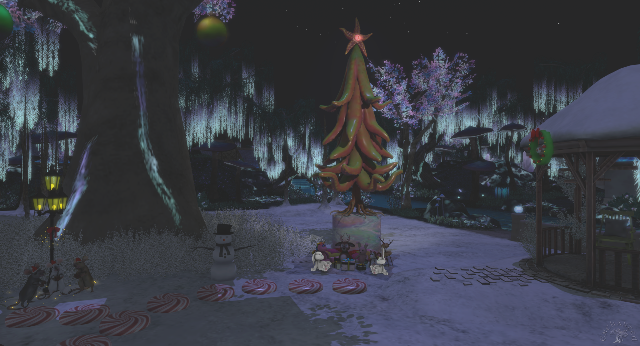 I love my little peppermint stepping stones! The lady from Lore made them, and they are fun in a bucket. Let’s see. I have singing rats (Pixie will just love them!), a snowman (just an ordinary snow man!), little plushie animals waiting to open their presents, a winter gazebo with one of The Dark Fae’s beautiful wreaths, and, another, larger, tentacle tree. Because it just looks nice there.