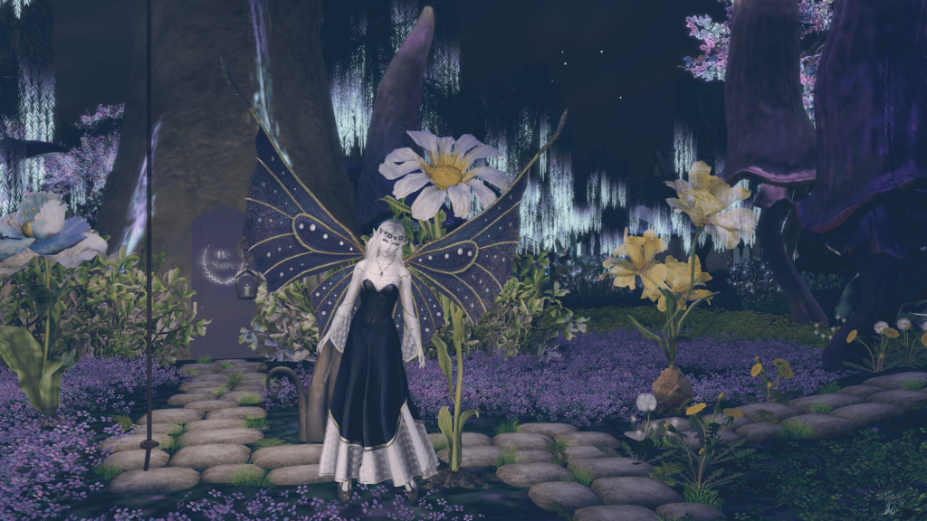 I’ll talk about the treehouse itself another time: the best thing about having a home away from home that’s in a massive tree is, of course, there’s so much space for a little garden. It is most beautiful at night, because the Realm comes alive with bioluminescent trees and plants, so I asked Brán along to shoot these pictures at night. There’s a rope to climb to access the treehouse proper, but I chose to add a portal for those who prefer not to find themselves plagued by rope burns.