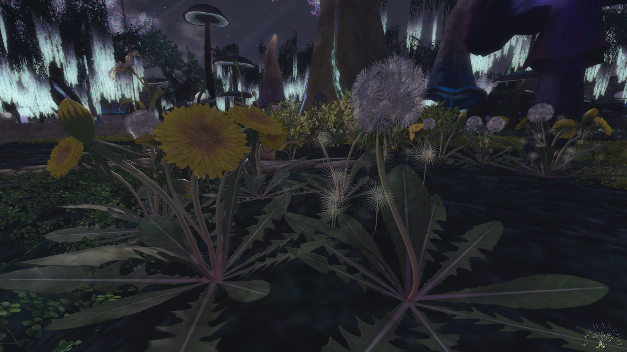 The combination of green and purple grasses works with the dark and light shifts of the Realm beautifully, and I added in some of my favourite large flowers and mushrooms to give a combination of whimsy and mystery. My favourite small flower, the dandelion, is here as well.