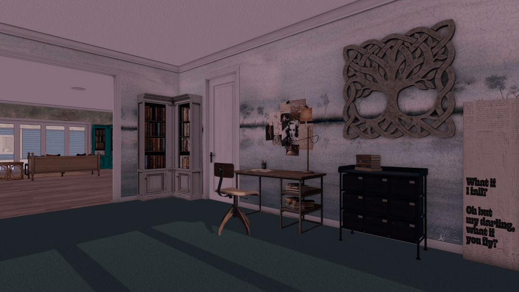 A home wouldn’t be a home without a place to write, and I wanted this one to feel both calming and inspirational. The desk, chair, and art wall (with some bits customised) are Nutmeg’s Thrifted Study collection, and the up cycled cabinet is from Kraftwork, along with the book stack and the What if I fall board. The beautiful Tree of Life is from the artistic mind of Fantasy Illuminations, and of course that’s another Apple Fall Mercantile bookshelf, this time in white.