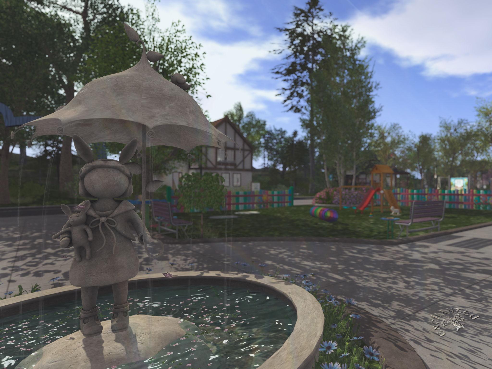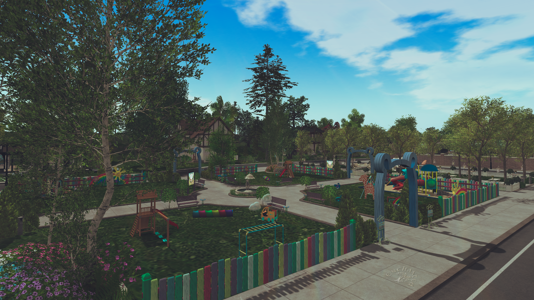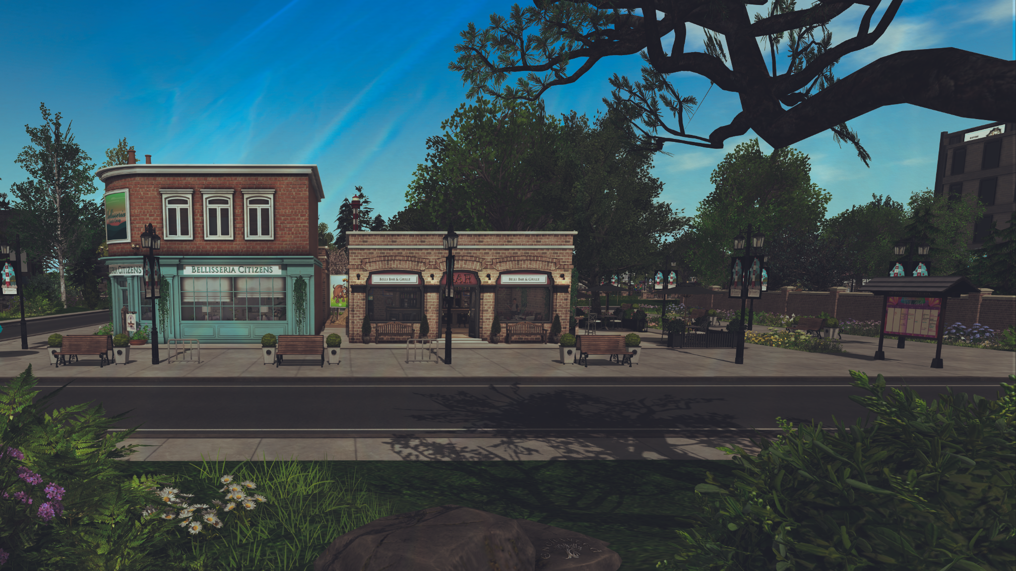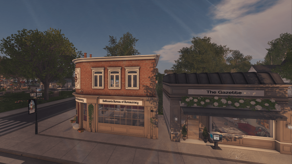 Speaking of afternoon shadows, as I walked back from the play area toward the town square, the Bellisseria Bureau of Bureaucracy and the Gazette offices were benefiting from some nice fading light and lengthening shadows, themselves.