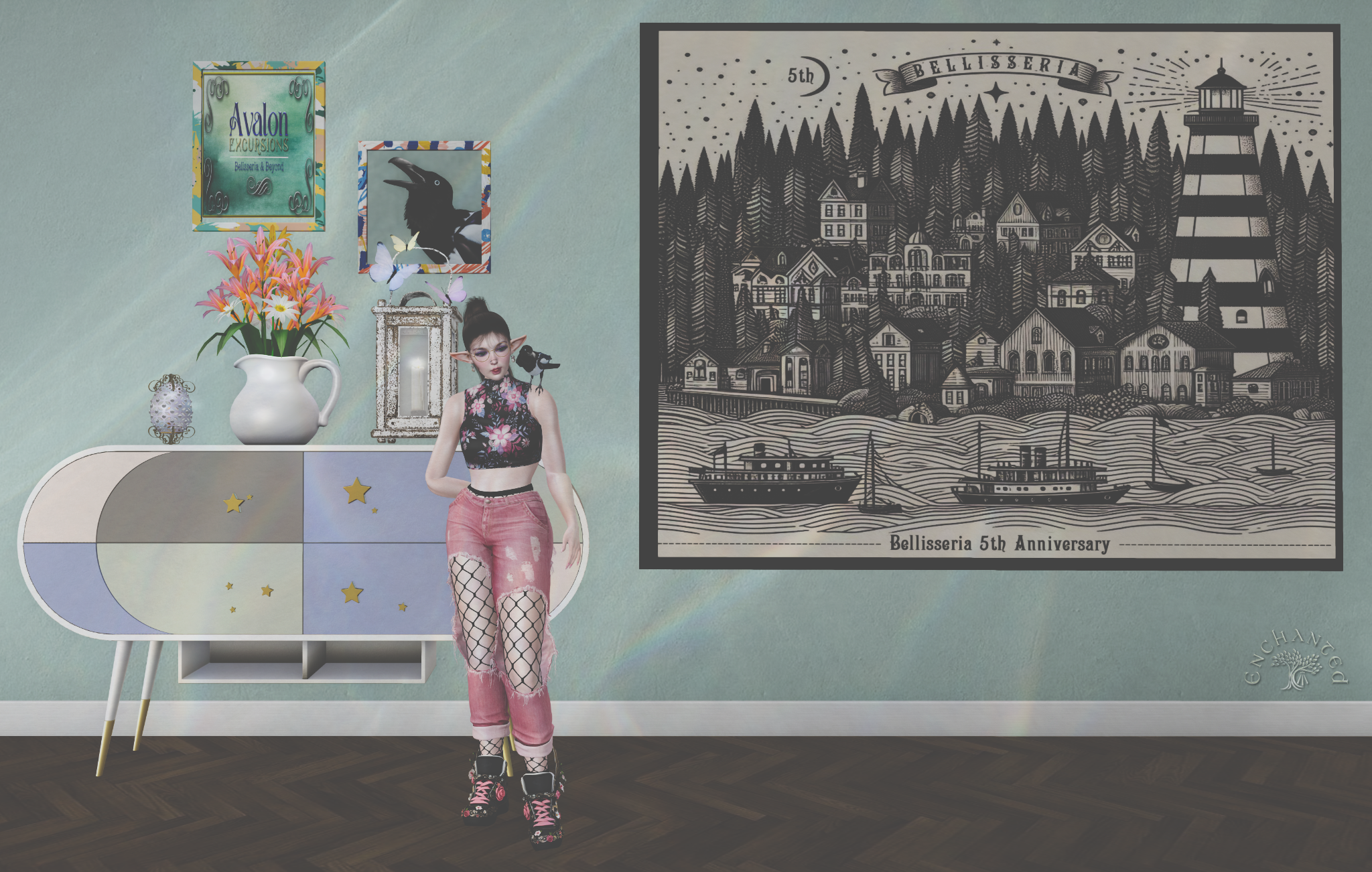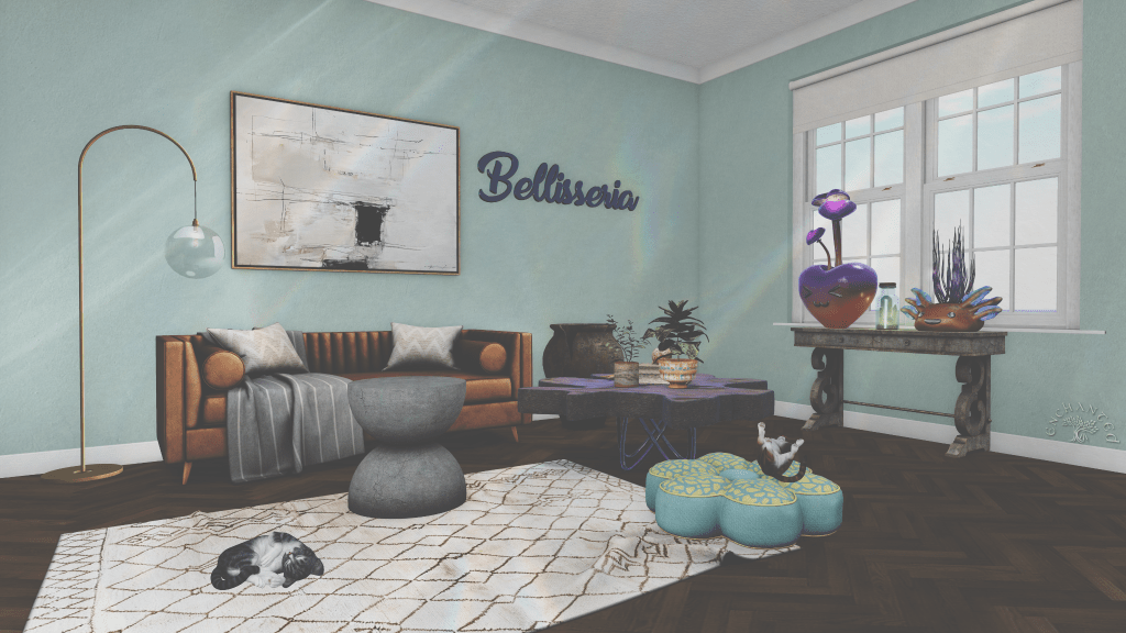 In this photo, the one item that’s not a gift is again the console table. This one is from Nutmeg: it’s the Quaint Foyer Console. Quite a lot of what you see here is from this amazing gift from Bazar. It’s a complete living room, just called Bellisseria Living Room, and it includes the sofa, lamp, white and black artwork, the grey table, and the rug you see here. The Bellisseria sign (like the one outside the house) is from Givoria, and there are tintable and PBR versions of this in the gift box. I wish I’d been able to place the large vase so you could see it better; it’s really lovely. It’s from Fayded, called Rustic Vase. The large table with all the deco on it is from Atrium, the Tui Center Table. On the console table is just a small selection of some of the beautiful gifts from Cerridwen’s Cauldron. Here you see the Heart Pothead, two Bottled Crystals (one is PURPLE), and the Axolatl Pothead. On Lalou‘s Flower Sit Pillow, and on the rug from Bazar are two kitties from Esoterica. So it’s possible to (mostly) decorate a whole room with just gifts from the Bellisseria 5th Anniversary Event.