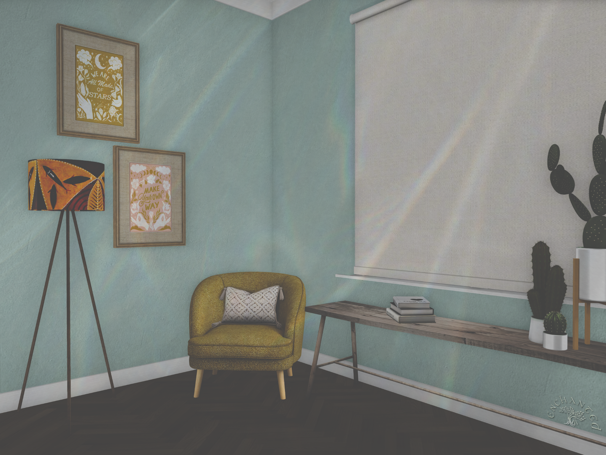 Here, you can see the gift from Petite Mort, the Elba Gold Chair and Pictures. The lamp is part of the gift set from Amandat Tamatzui Art Gallery; this is the Four Corners Tall Lamp. The books on the table (another borrowed item from Gwen; this one is the Scarlet Creative Monteverde Console Table) are part of the Living Room set from Bazar, and the cacti are from Chez Moi, but they appear more clearly in the next photograph.
