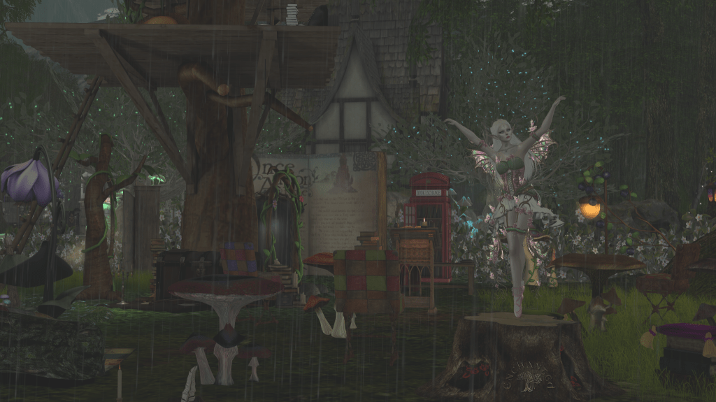 I can’t properly celebrate a good thunderstorm without dancing in it. It helps that fae magic keeps me dry and never makes my hair frizz out. Here, you can see how luminous the wings are on this gorgeous outfit.