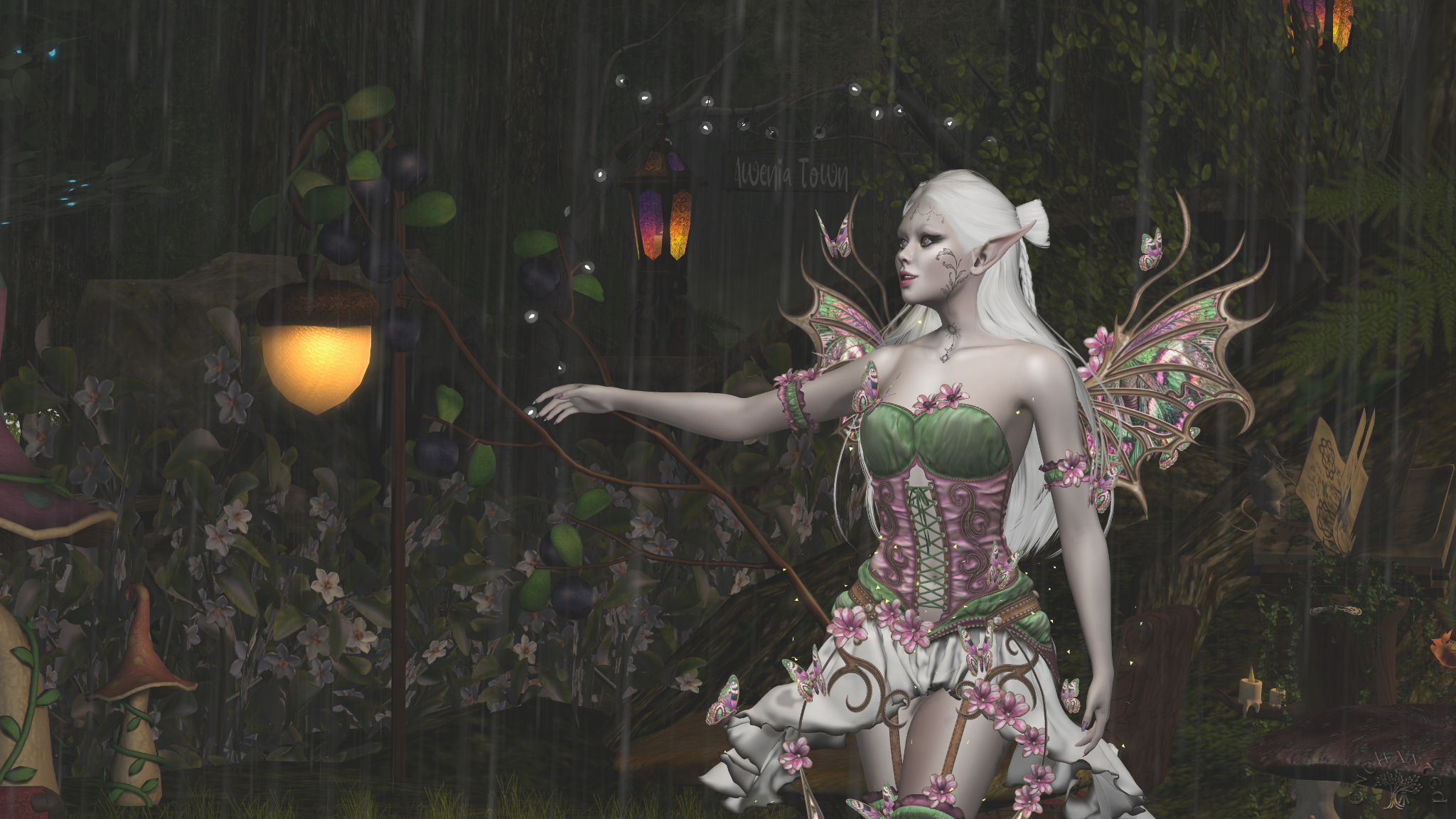 I can’t properly celebrate a good thunderstorm without dancing in it. It helps that fae magic keeps me dry and never makes my hair frizz out. Here, you can see how luminous the wings are on this gorgeous outfit.
