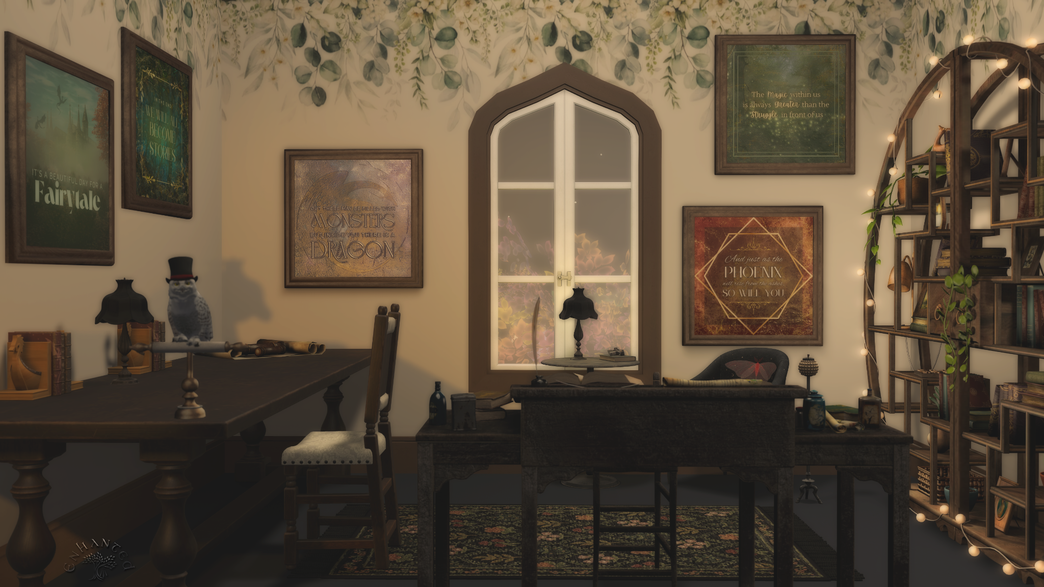 Well, the office is beautiful! It’s as if someone designed it just for the person I am becoming rather than the person I was. A familiar library table, a versatile desk, a pretty bookshelf to look at, and even a perch for Uggla on the library table. I especially like the framed signs on the wall: they will be very good for when I’m having a difficult work day. My favourite one reads, Out there may be filled with monsters, but inside you there is a dragon.